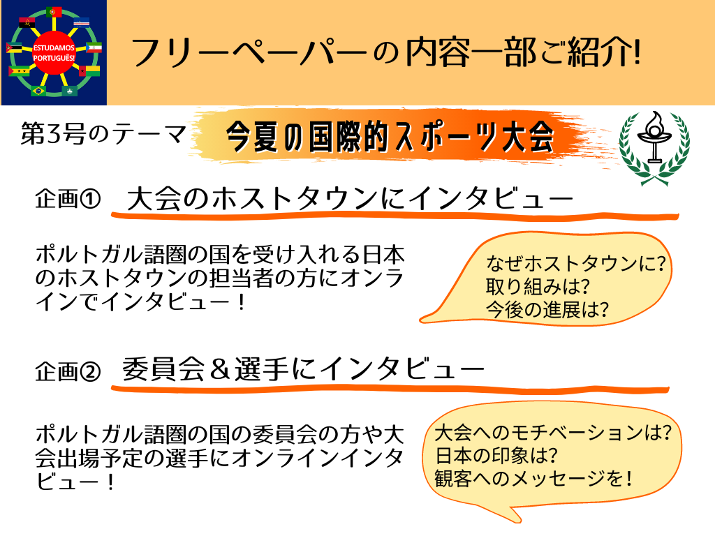 また今回のフリーペーパーでは、この夏に東京での開催を控える国際的スポーツ大会をテーマとして、ポルトガル語圏と関わる方々へのインタビューを企画しています。