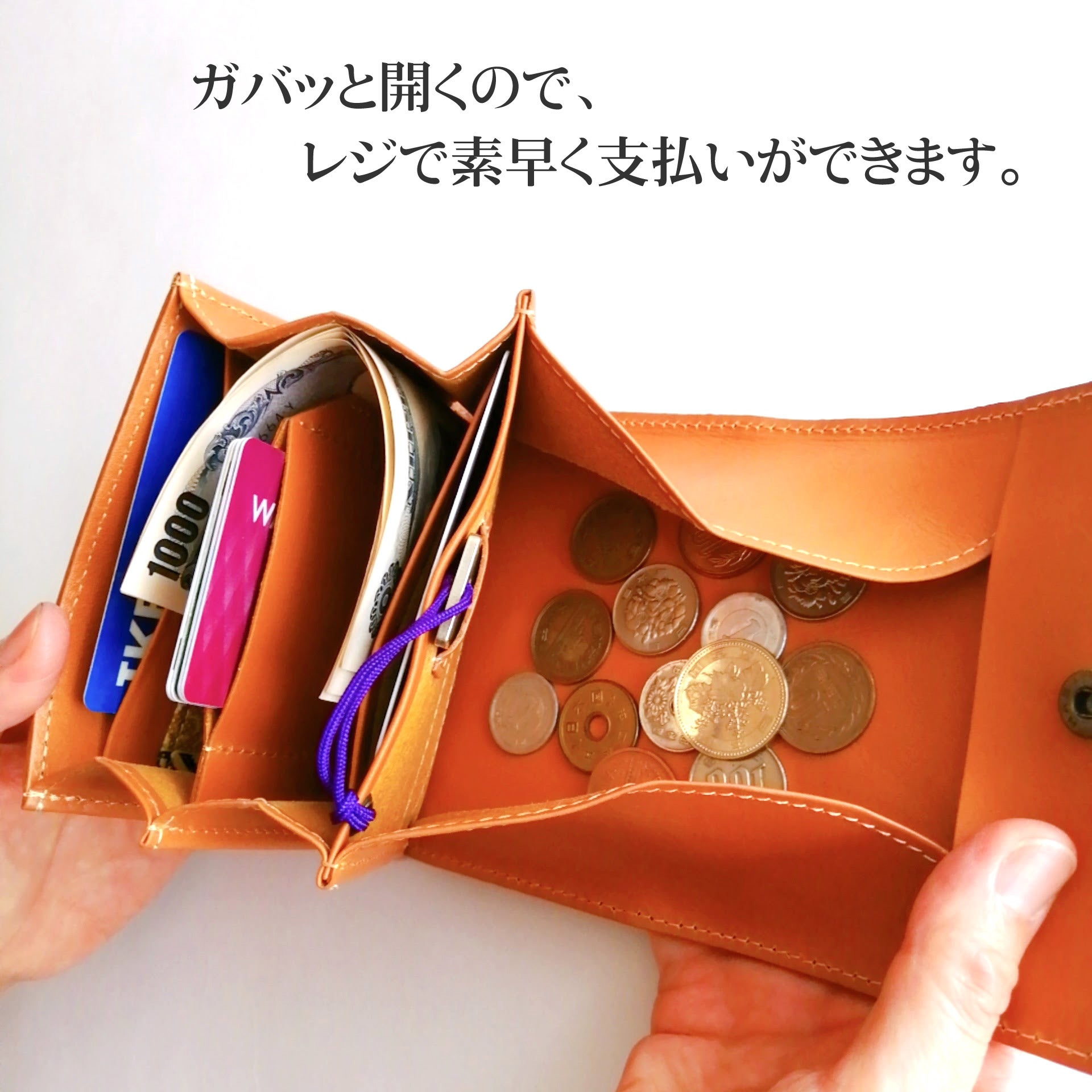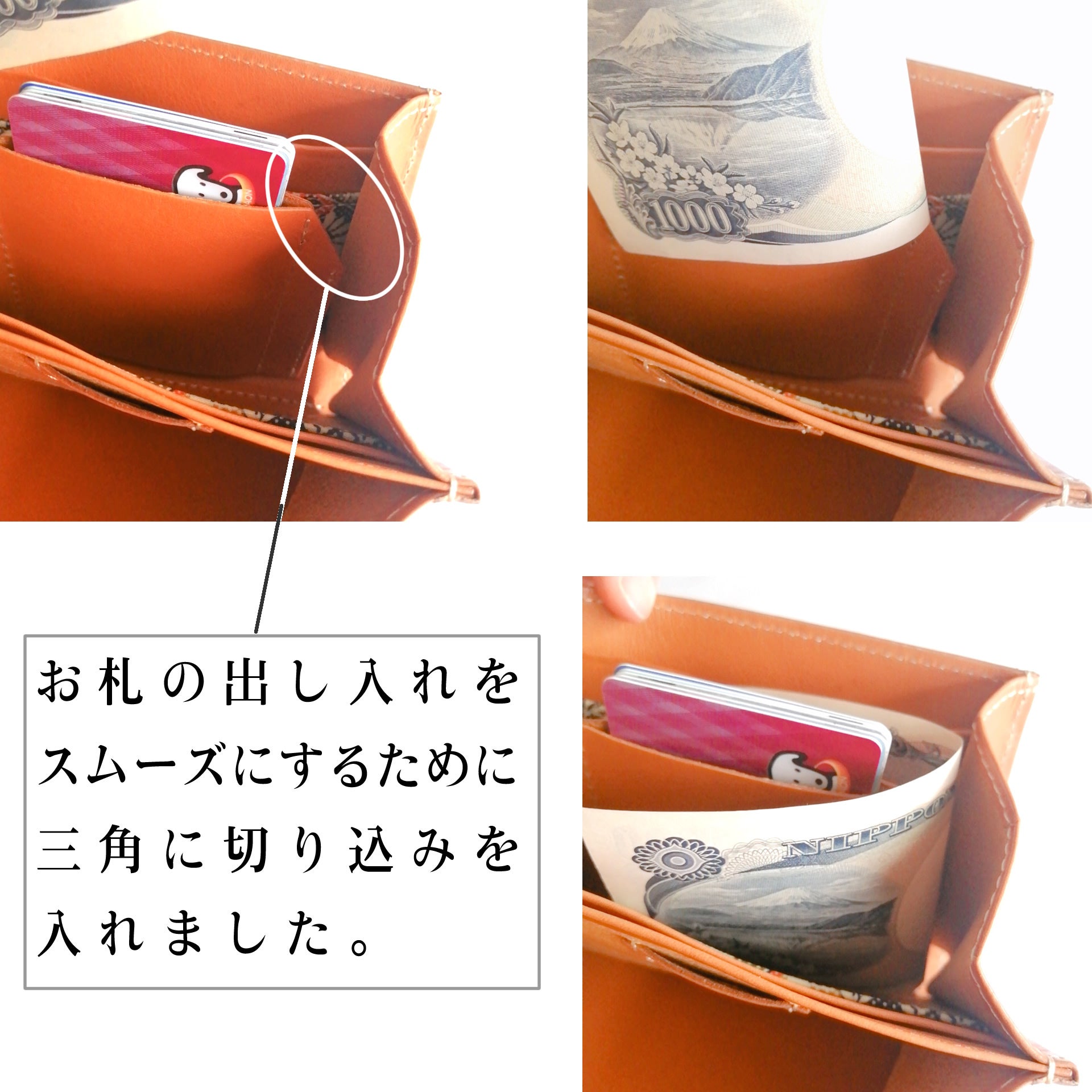 大きく開いて一度の開く動作で、小銭・お札・カードの全てにアクセスできるように工夫をしました。