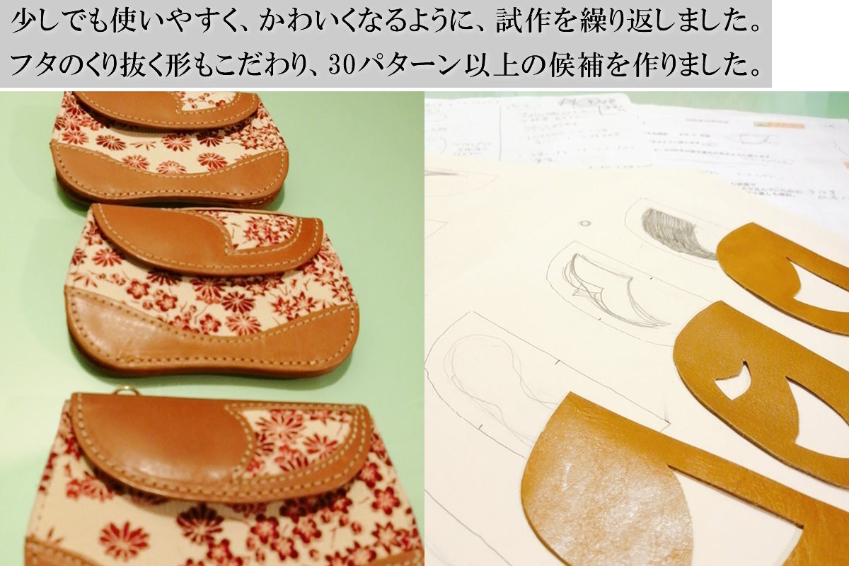 女性のための可愛い・小さい財布が少ないと、感じた店長フシイは、10年ほど前に優しい印象のやわらかい曲線をもつコインパース【ウクレレ】をデザインしました。熟練の財布職人さんも作ったことがないデザインだったので、何度も何度も作り直しをしました。
