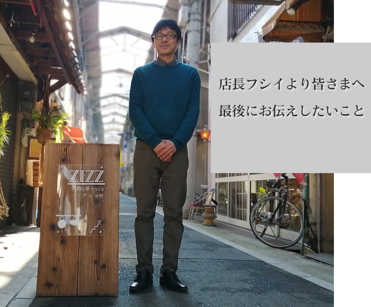 はじめまして、ZIZZ(ジズ)の店長フシイと申します。「日本人に、さりげなく似合うバッグを作りたい」と思い、大阪の中津で、着物と革でバッグを作り始め20年が経ちました。