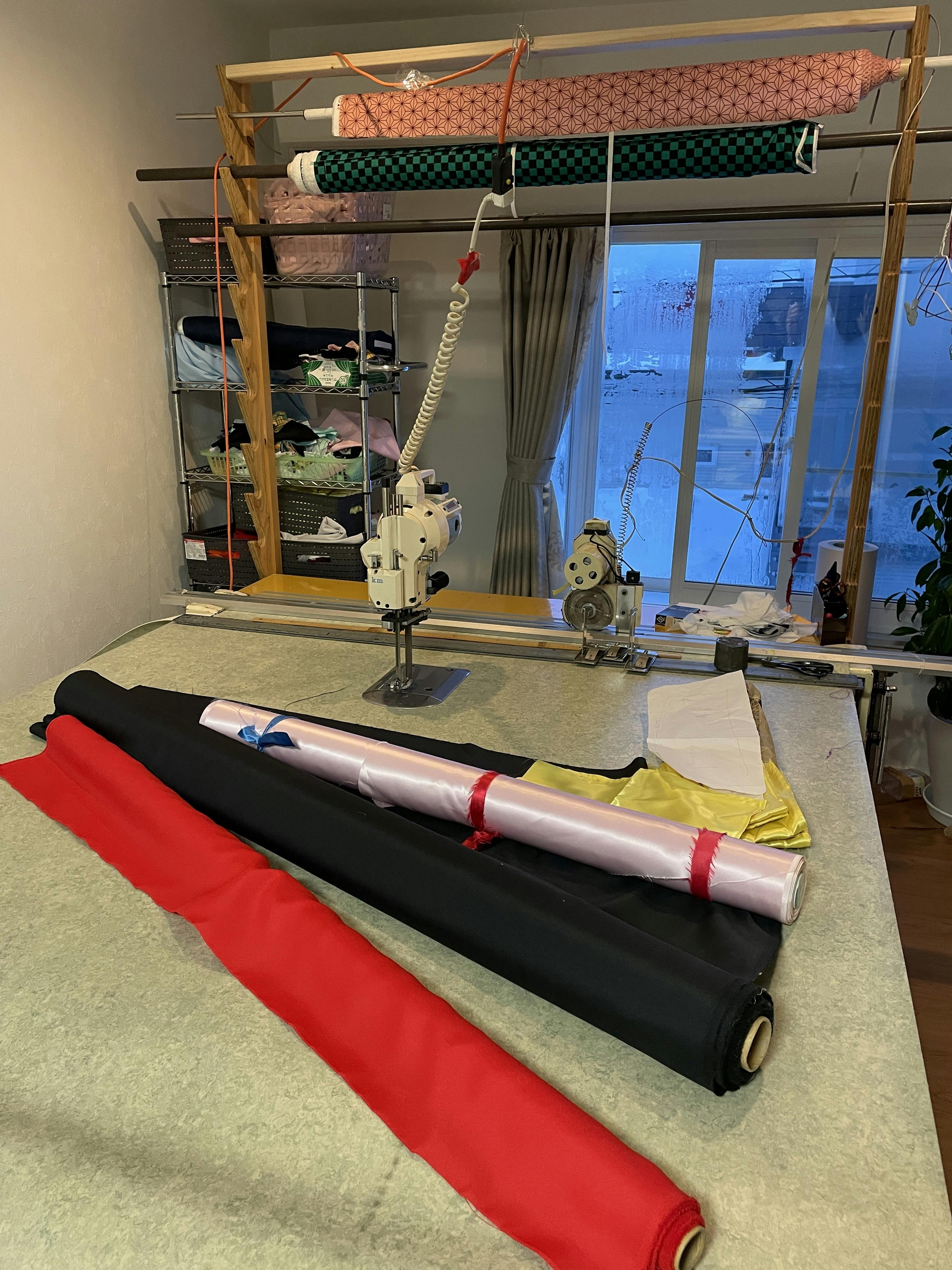 一年前、この衣装を作るために用意した建物と作業部屋。コロナブランクで勘が鈍ってるのを早く戻したいです。裁断台を作ってもらって、一年経ってから初めてよさこい衣装の裁断をします。