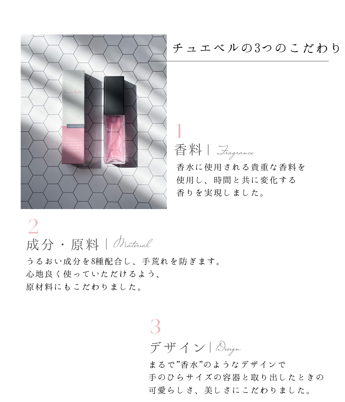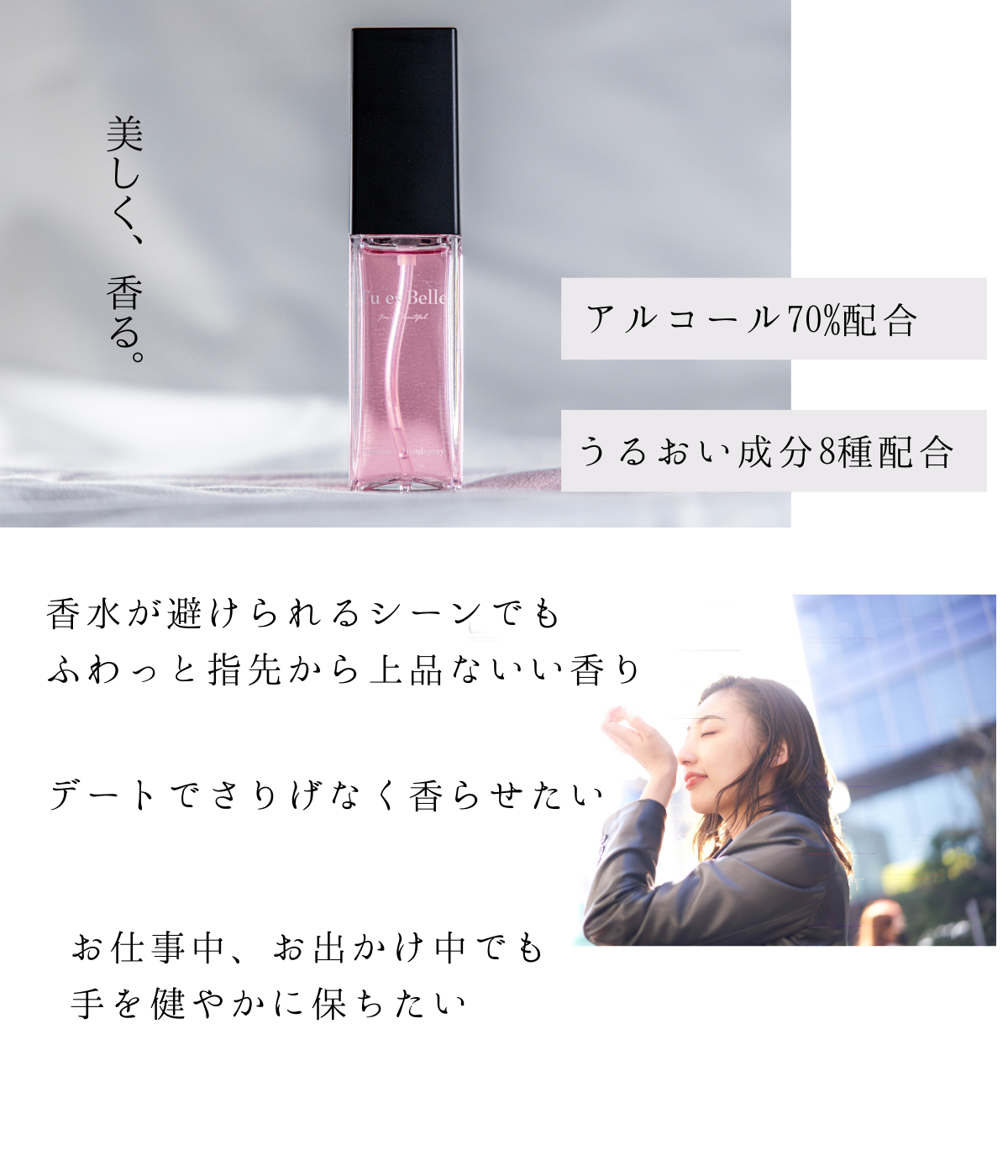 『Tu es Belle|チュエベル』は、"美しさ"をテーマとし、日々明るく振る舞って疲れている女性が、昨日よりもほんの少し自分を好きになるために生まれたブランドです。”アルコール70%&うるおい成分8種配合”の『フレグランスハンドスプレー』で"ありのままの美しさ"へ語りかけられたらなと思います。