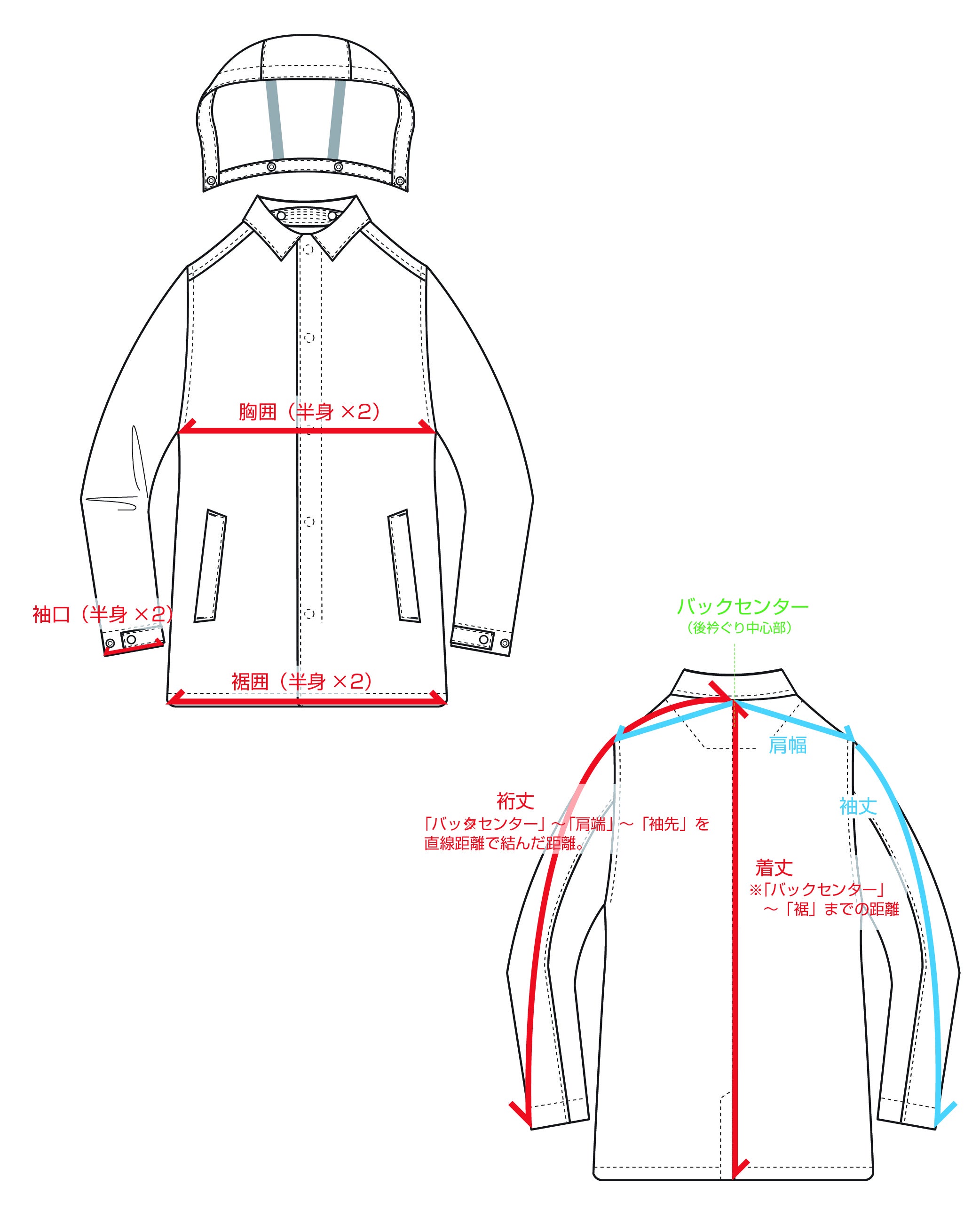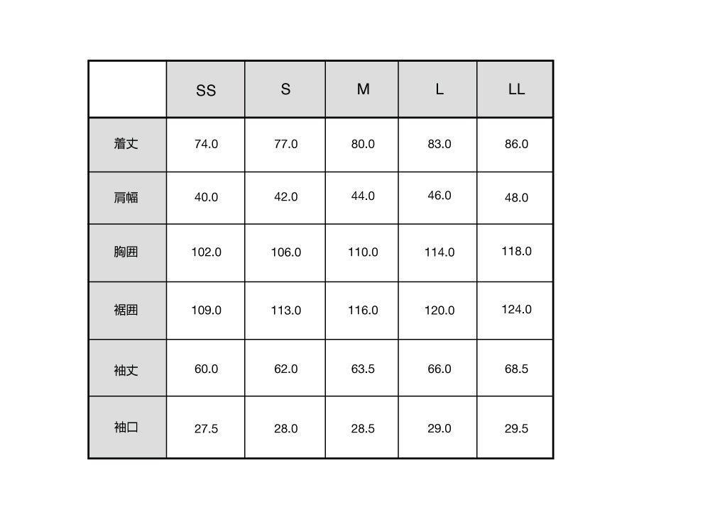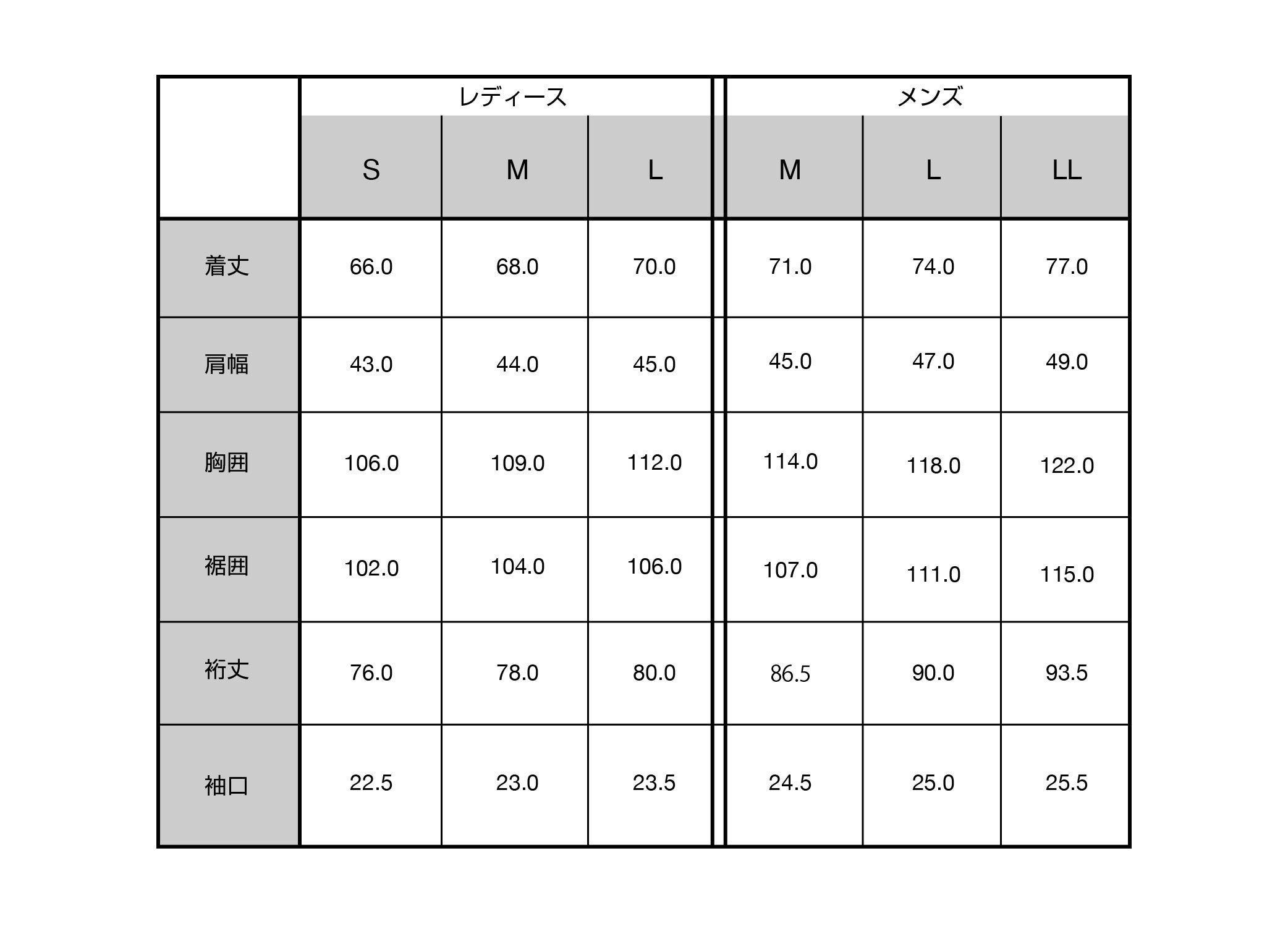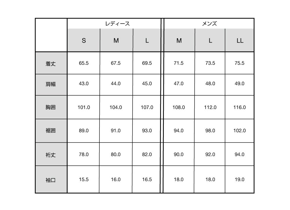 Rain Coat(Unisex) サイズ表