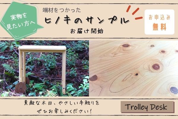 そういったお客さまに少しでも当デスクの素材の良さを知っていただけるよう、ヒノキ無垢材の無料サンプル品をご提供いたします。