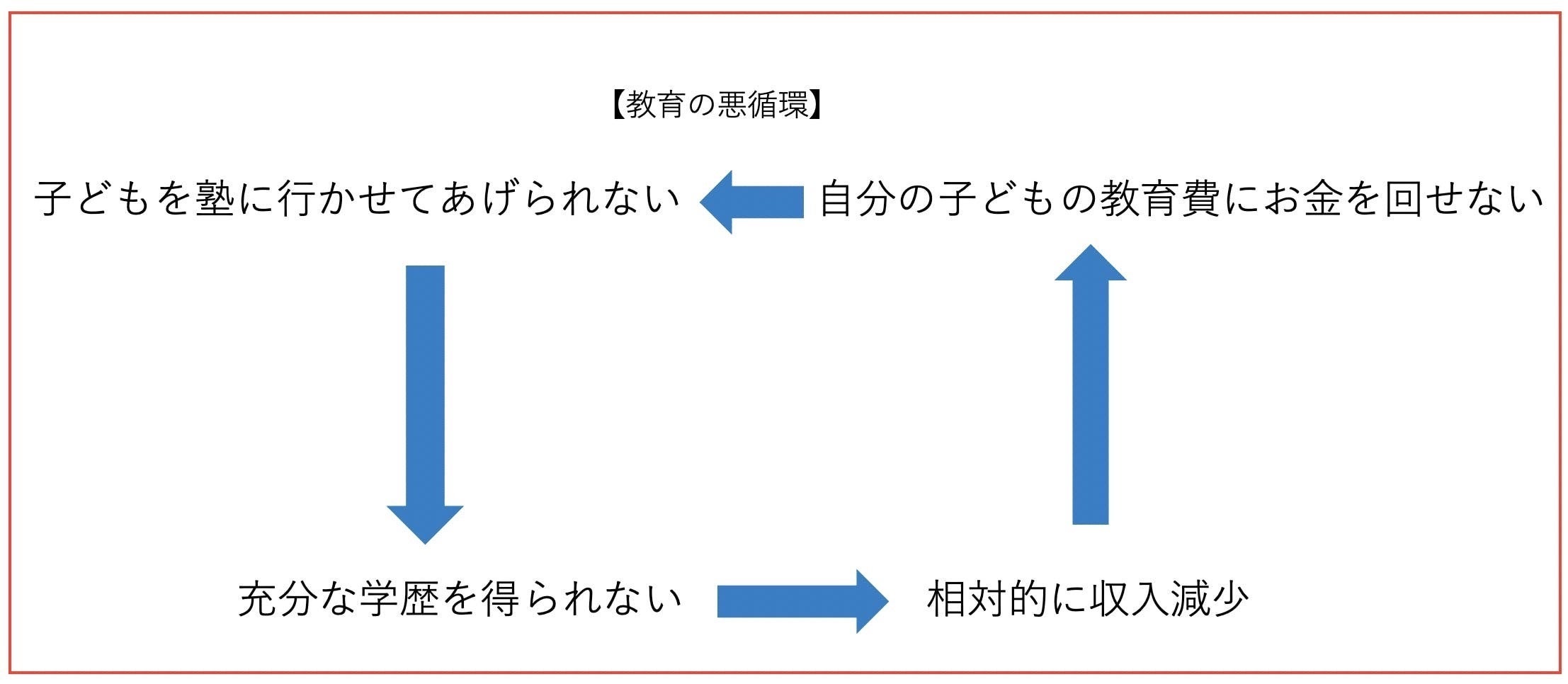 現実問題として、塾に通った方が成績は上がりやすいですが、経済的に余裕のない家庭は子どもの教育にお金をかけることができず、教育の悪循環に飲み込まれてしまいます。