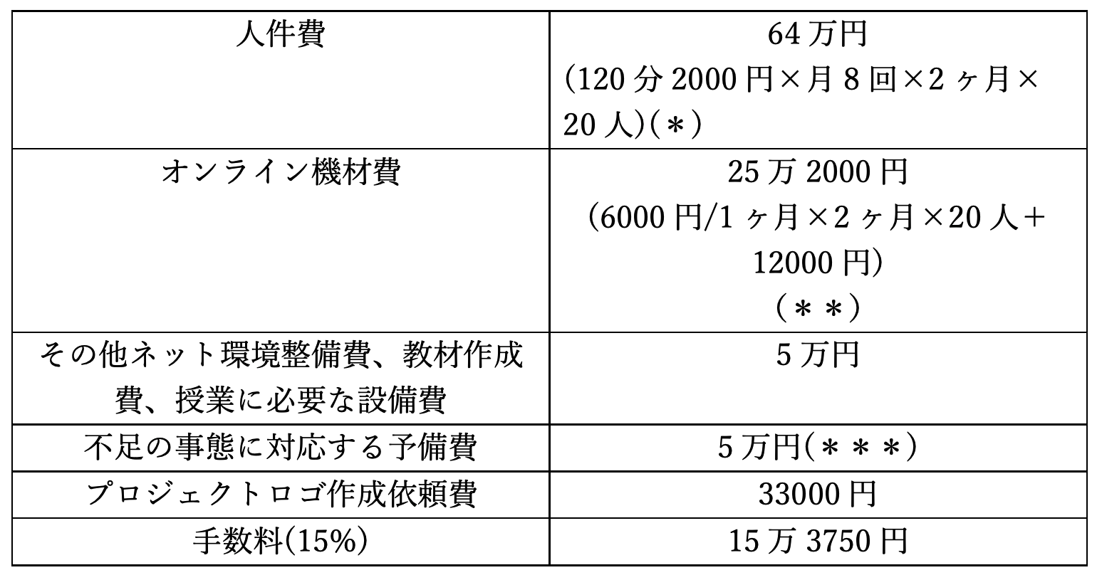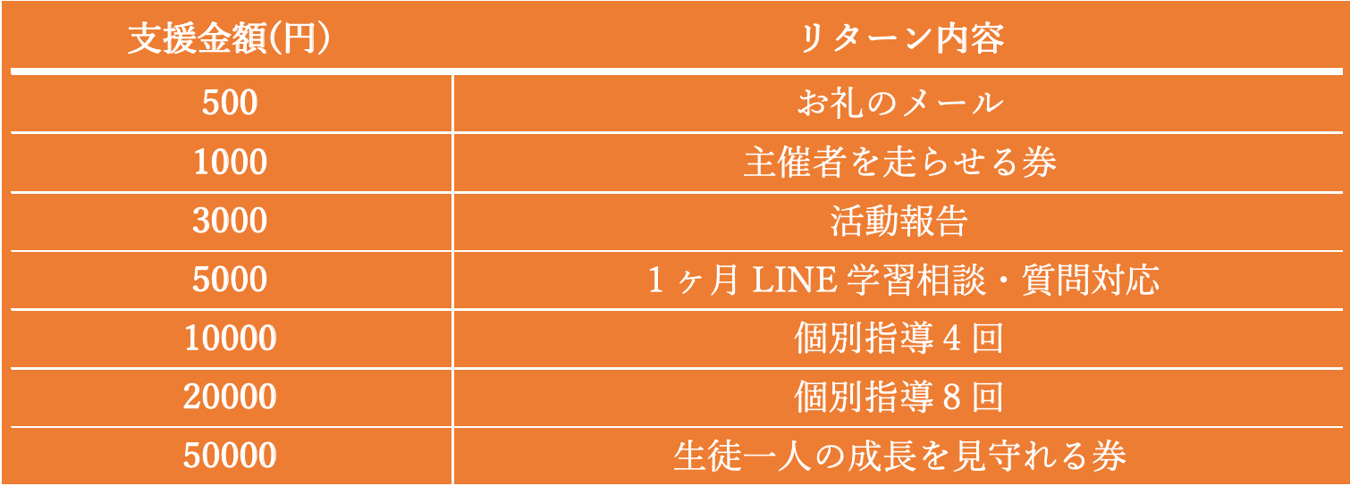 ※生徒1人は44600円(機材費込み)のご支援で2か月間勉強することができます。