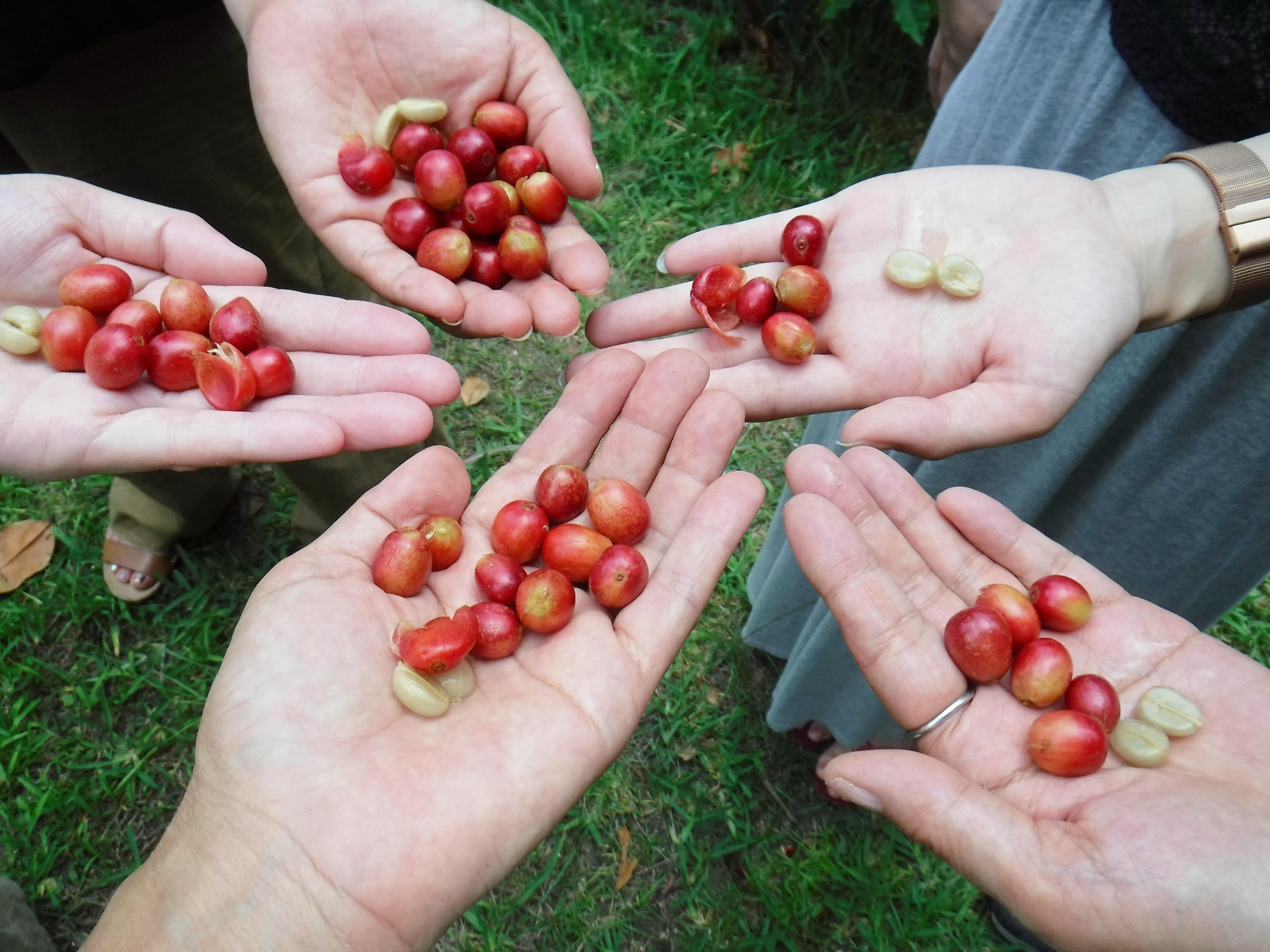 一列に並んだコーヒーの実から赤く熟した物を選んでピックして皮を剥く作業が体験できます。コーヒーチェリーの酸味と旨味を知ることができるのも貴重な体験です。