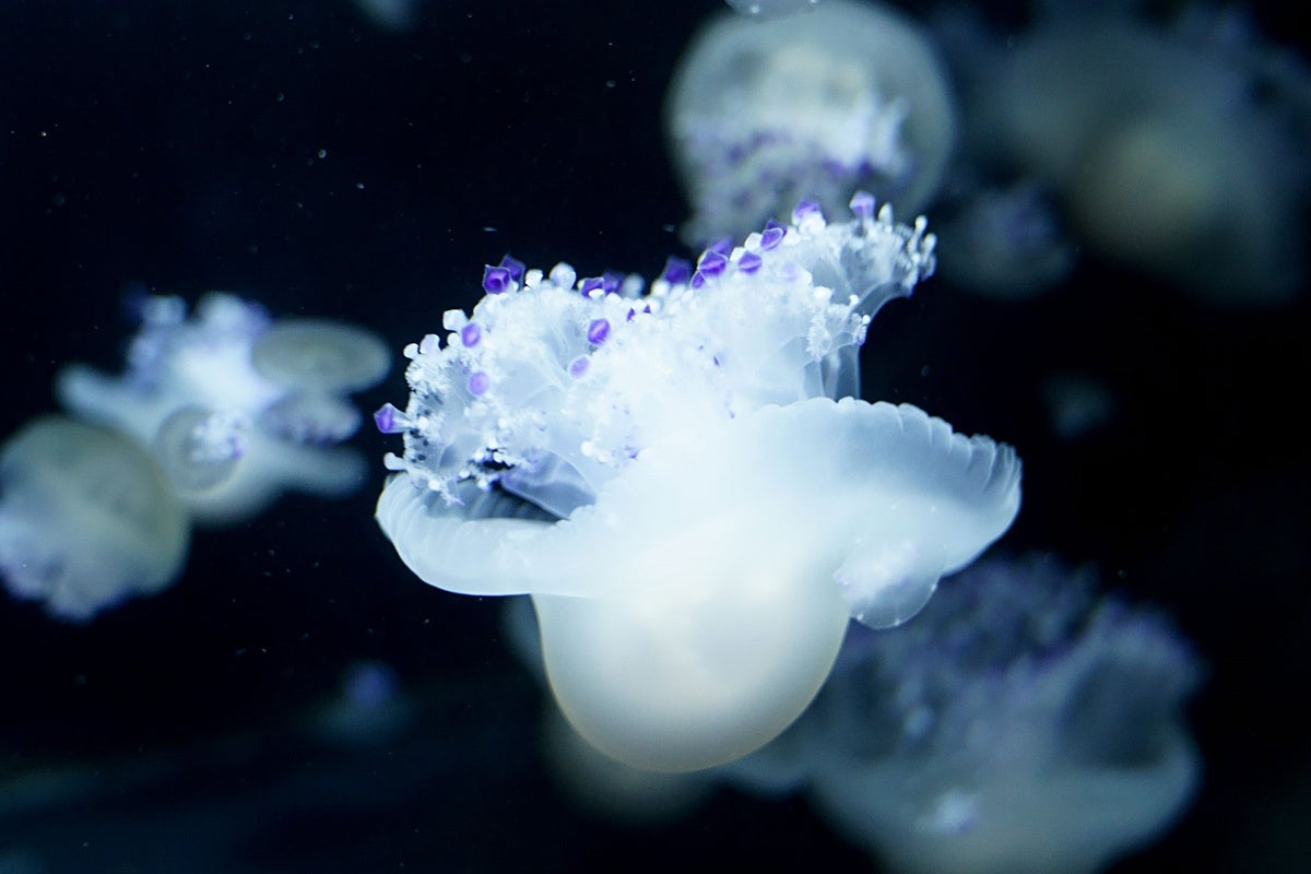 海水と淡水が入り混じった水域に棲む大型クラゲで、水槽では海水と淡水を混ぜて飼育しています。透明感のある白さが美しいクラゲです。