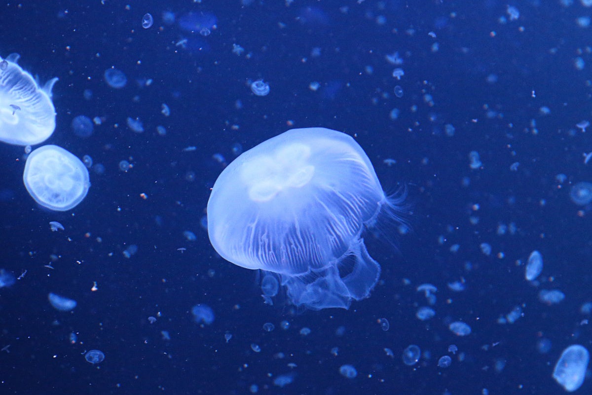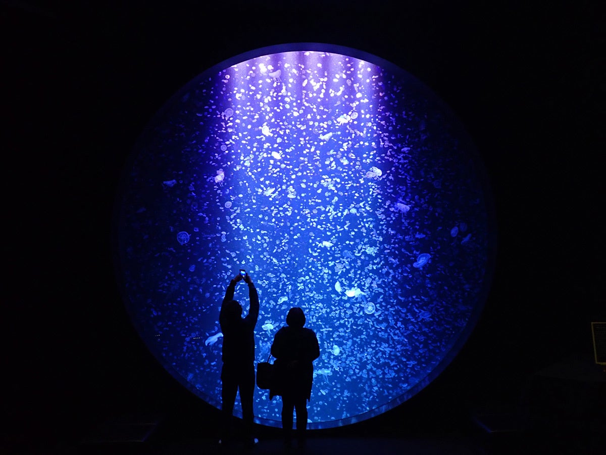 世界に誇る、直径5mの水槽「クラゲドリームシアター」。大小様々な約1万匹のミズクラゲが浮遊する、とても幻想的な光景が日常を忘れさせてくれます。