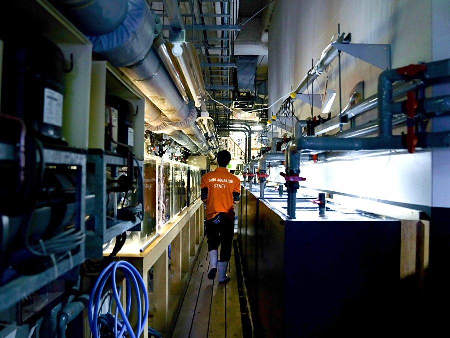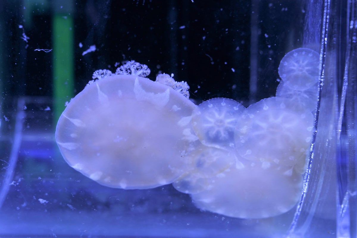 閉館の危機に直面する状況の中、企画展として『生きたサンゴと珊瑚礁の魚展』を開くことに。その準備をしていた際、偶然、サンゴの水槽に3~4mmの小さな生き物が30個体程泳いでいるのを発見。それがサカサクラゲの赤ちゃんでした。えさを食べさせ、500円玉くらい大きくなった段階で展示をしてみると、お客さんが大喜び。「そこからクラゲがおもしろくなりました」(奥泉館長)