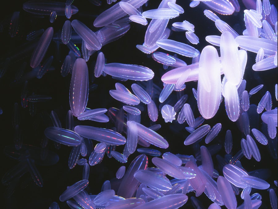 シンカイウリクラゲは水深500~1000mという水深の深い場所で生活しています。最大で15cm程に成長するクラゲで、その名の通りウリ(瓜)型の形をしていることから名前が付けられました。特徴としては、櫛板という体表面にある毛を動かす際に光を反射することで綺麗に光っているように見えます。