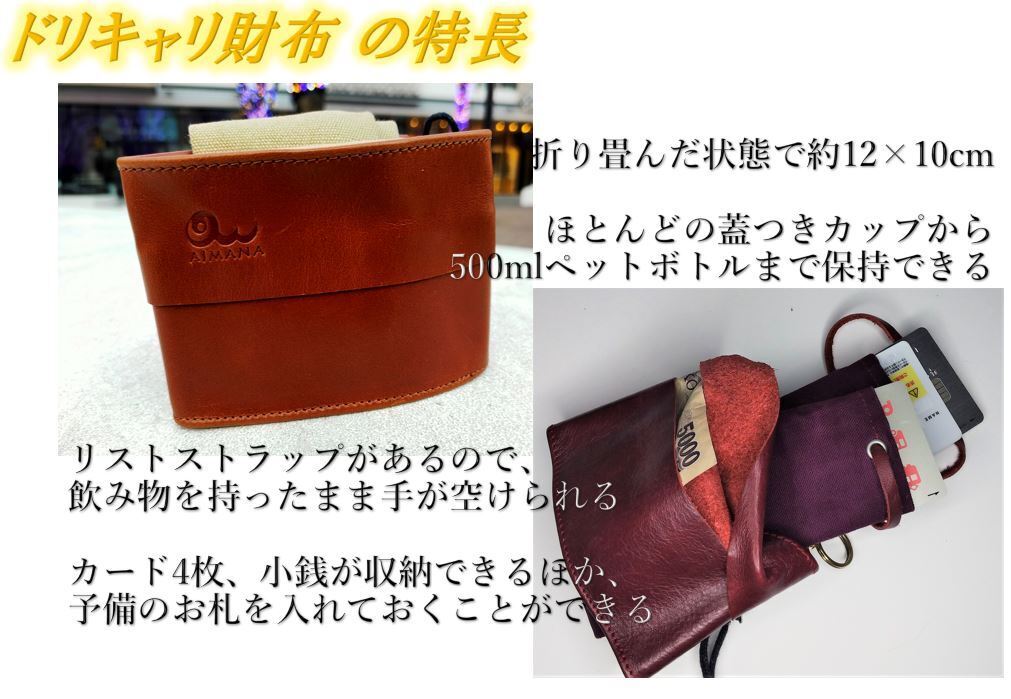 ・「ドリキャリ財布」でドリンクを運ぶ際は、水平方向の皮革部分の長さと、布部分の可動域でバランスを調整して、安全を確かめてから、なるべく揺らさないようにお持ちください。また、蓋のない容器は入れないでください。
