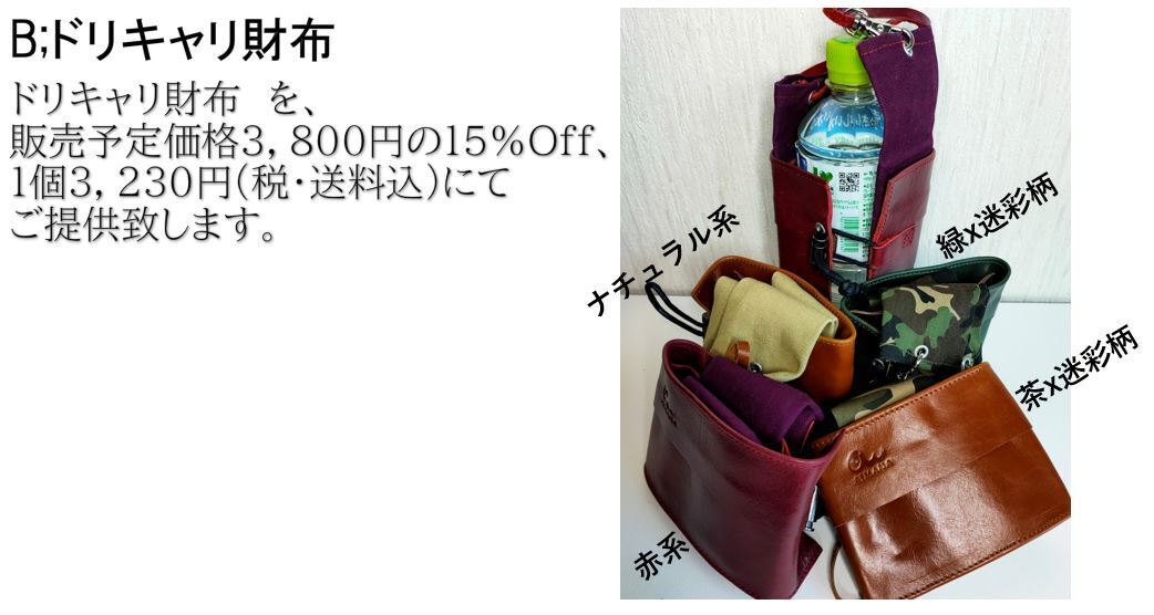 休日に少し遠出するのなら、両方を。「ドリキャリ財布」 はペットボトルもにも対応していますから、散策しながら水分補給が可能です。「キャッシュレス時代のお財布Ⅱ 」 がコンパクトなので、両方を持ってもポケット2個あれば手ぶらで歩き回れます。
