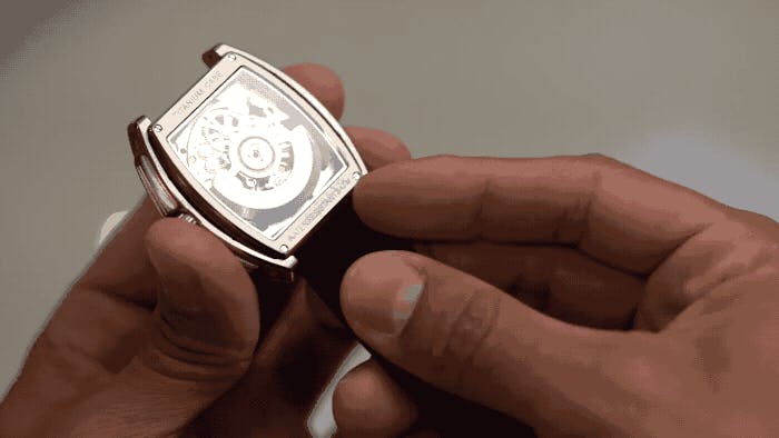 シースルーバックなのでムーブメントの分秒刻みの動きまで余すところなく見ることができます。裏からは半円型のローターが見えます。腕につけたとき、腕の動きを拾って、ローターが時計回りもしくは反時計回りに回転し、どちらに回転してもそのエネルギーを拾いゼンマイを巻き上げます。もし腕につけている時間が少ないなどの理由で、自動巻きでは巻き上げが足りない場合は、リューズを手で巻くことも可能です。概ね1~30回転でフルに巻き上げられます。