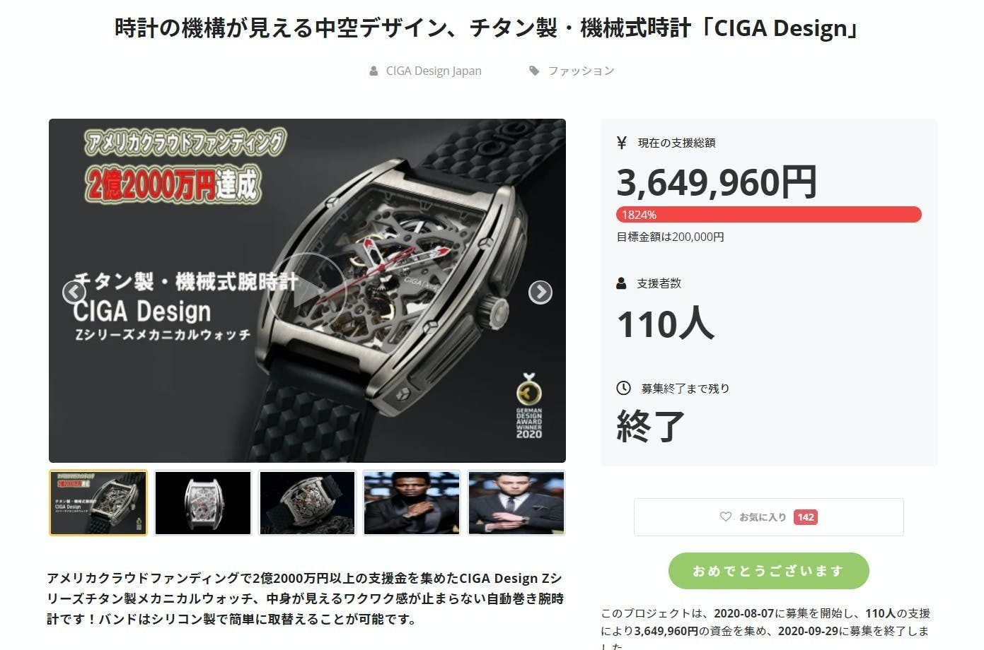 2021/01/20 18:47いつもお世話になっております。去年8月に実施した第一弾の募集では、目標金額を大きく上回る熱いご支援を頂き、改めて御礼申し上げます。 「購入したいのに前回は購入できなかった等の反響が大きく」 第二弾を実施することになりました。この度は時計の機構が見える中空デザイン、チタン製・機械式時計「CIGA Design」にご関心いただきまして、誠にありがとうございます!本日、プロジェクトをスタートいたしました。https://camp-fire.jp/projects/view/365258早速、ご支援をいただきました皆さま、本当にありがとうございます。最初にご用意したほとんどリターンは、プロジェクト終了後、すぐに皆様に発送できるよう、プロジェクトを進めてまいります。引き続きより多くの方々に時計の機構が見える中空デザイン、チタン製・機械式時計「CIGA Design」をお届けできるようスタッフ一同頑張りますのでSNSなどでの拡散にご協力頂けますと幸いです。引き続きよろしくお願い致します。 もっと見る