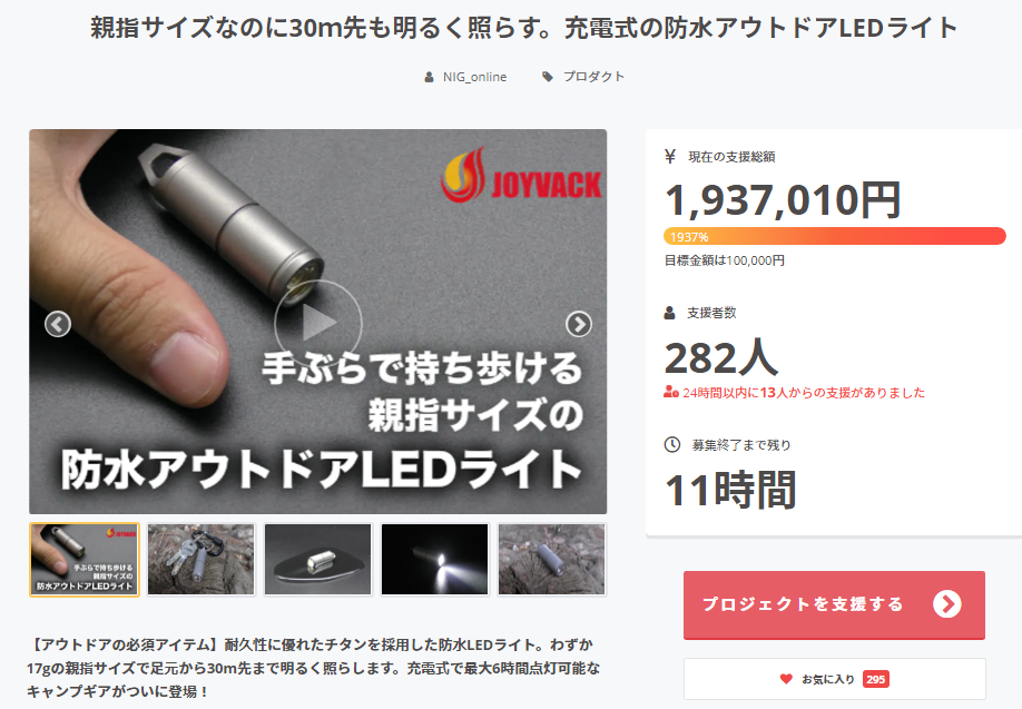昨日をもちまして、DAUMENプロジェクトの募集が終了いたしました。想定を大幅に上回る1,993,810円ものご支援をいただき、また、SNSや口コミでの多大なるご協力をいただきまして、誠にありがとうございました。商品は8月の発送予定とさせていただいておりますが、1日でも早くお届けできるよう進めて参ります。お届け予定につきましては、進展があり次第、こちらでご報告させていただければと思っております。※8月末までにお引越し等のご予定がある場合はお届け先の設定にご注意ください。引き続き、よろしくお願いいたします!Twitter公式アカウントhttps://twitter.com/joyvackInstagram公式アカウント https://www.instagram.com/joyvack_outdoor/JOYVACK事務局
