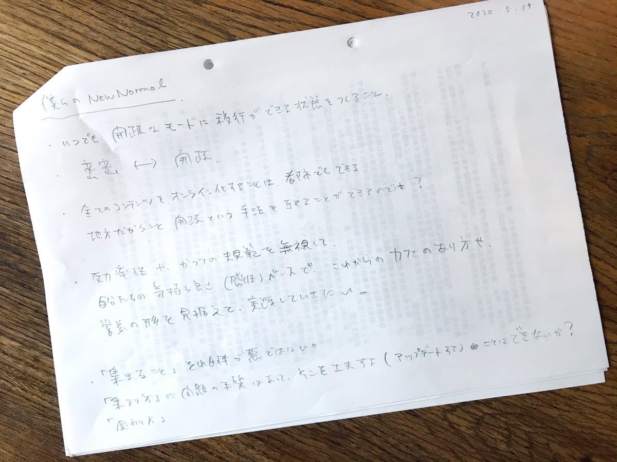 仰々しく「僕らのNew Normal」とタイトル書きされた裏紙のメモ(撮影:塚原)