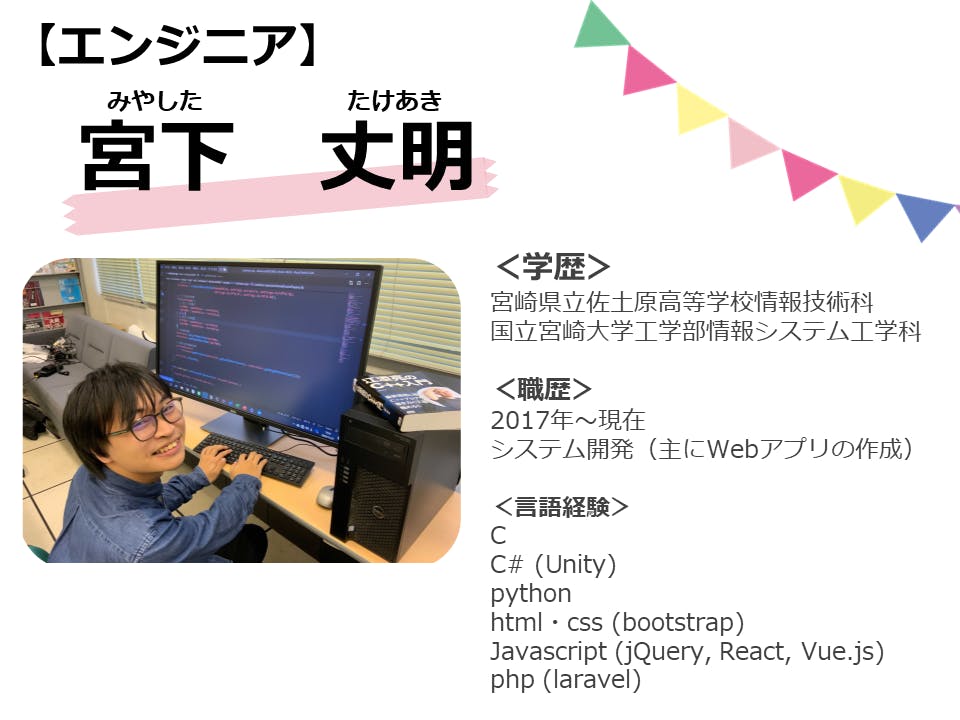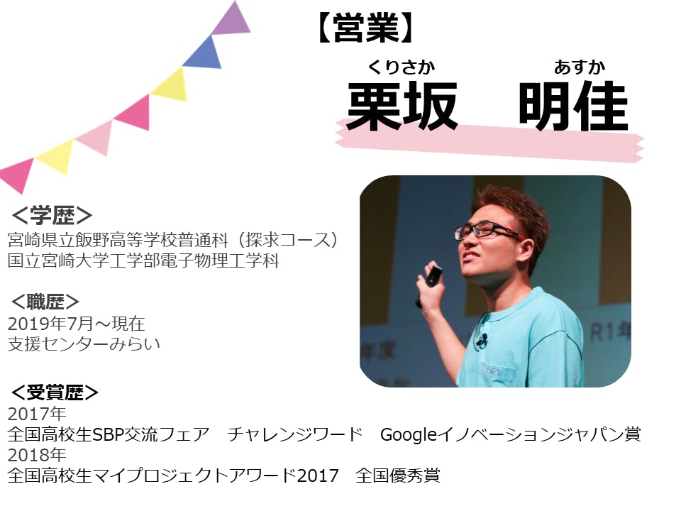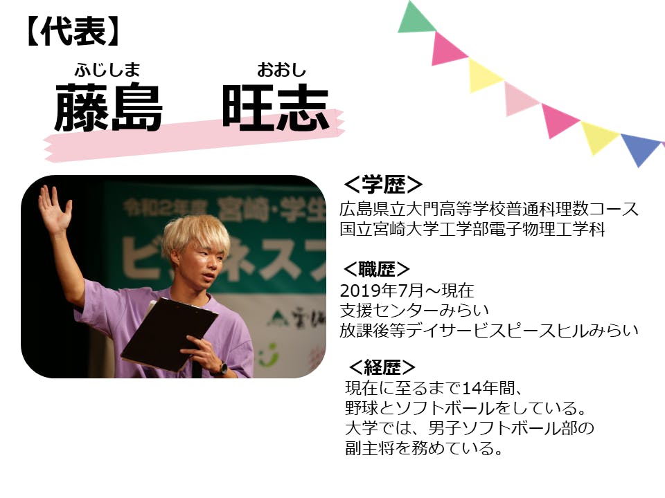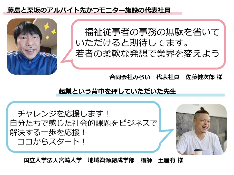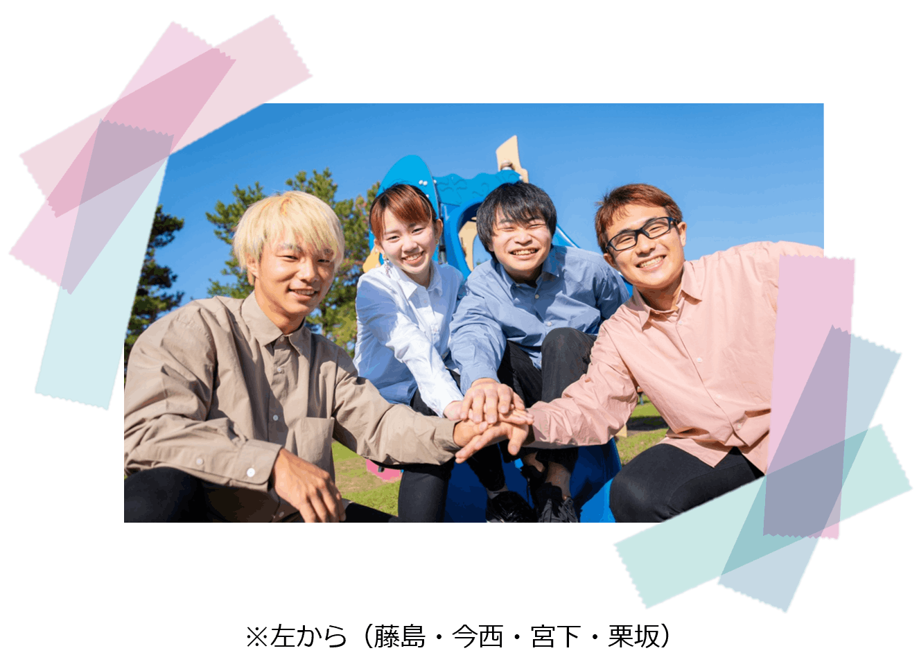 実は、藤島と栗坂は放課後等デイサービスと宮崎市独自のサービスの日中一時支援でアルバイトをしています。その中で、職員が連絡帳や書類業務に多くの時間を費やし子ども達と接する時間が減っていることに疑問を抱きました。また、今西は脳梗塞の影響で左半身麻痺になってしまった父親の介護を自宅で行っている当事者です。宮下は高校からプログラミングを学んでおり、Web制作の技術を得意としています。
