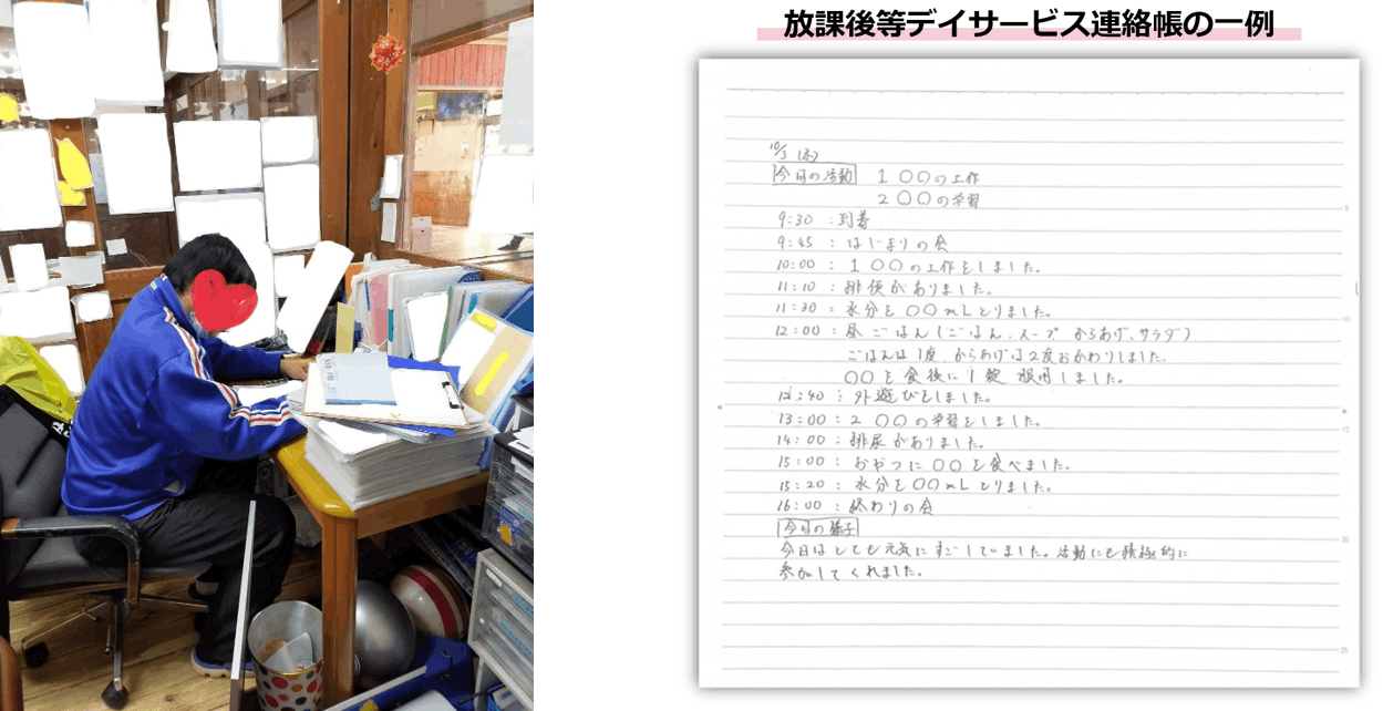 書類業務には主に2種類あります。1つ目は国保連(国民健康保険団体連合会)や役所などの行政に提出する書類です。これは、日々の児童の利用状況やサービス内容などを記載したもです。2つ目は保護者との日々の連絡帳です。保育園の連絡帳の内容に加えて、服薬や障がいについてなどを記載します。この2つの内容は一部重複しており、職員は何度も同じことを記載しなければならないのです。