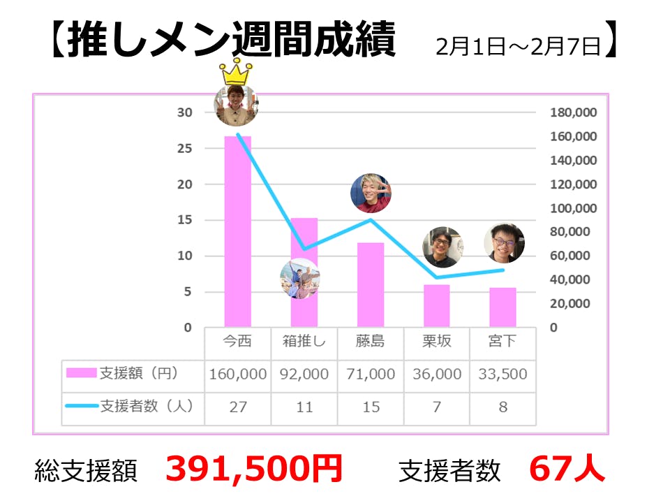 私たちのクラウドファンディングでは「推しメン」制度を導入しております。そこで、今回は2月1日から2月7日までの週間成績です。