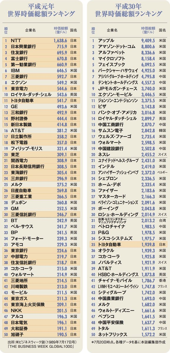 30年前、日本企業は上位に32社、現在ではトヨタ1社のみ。