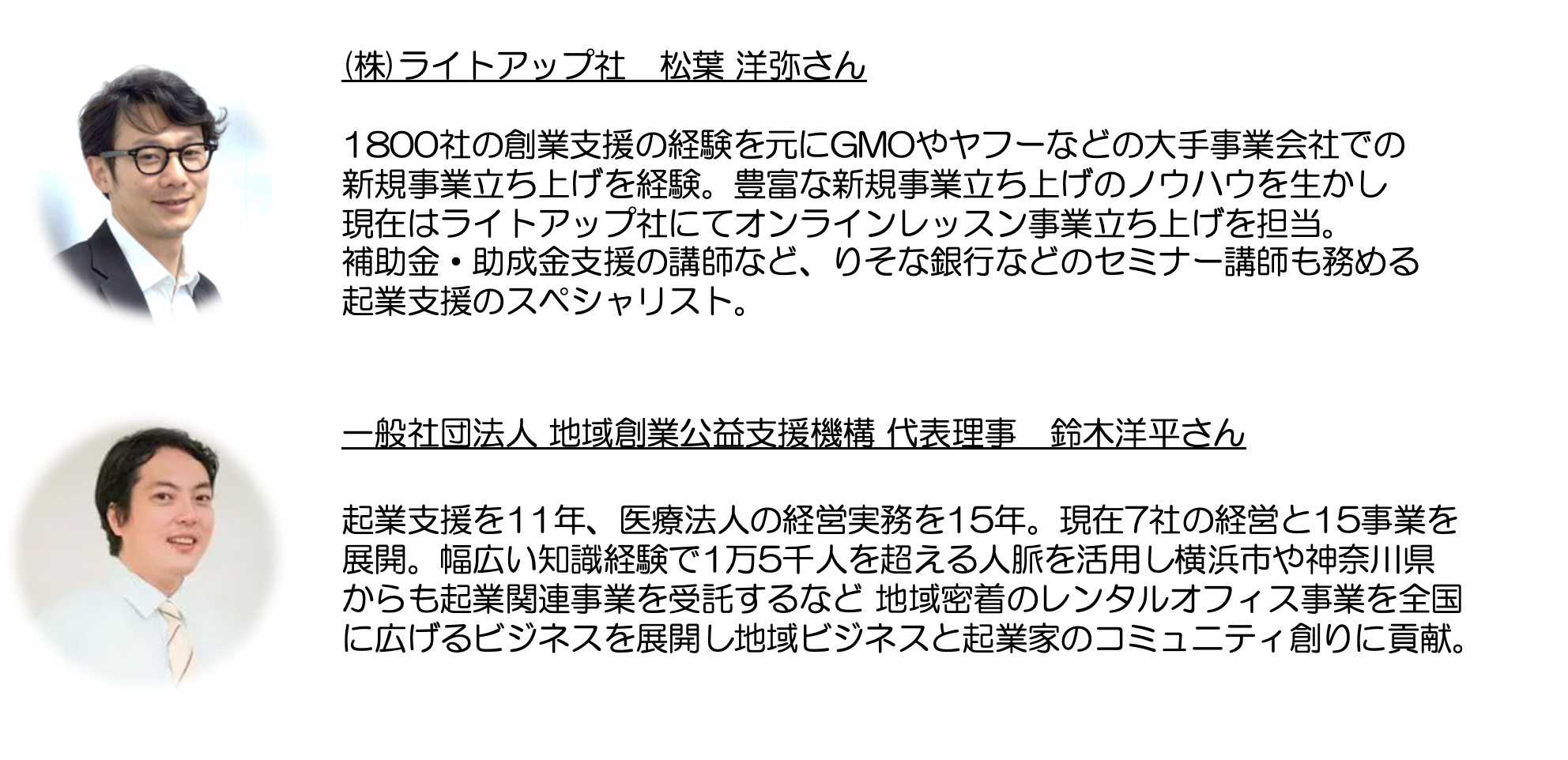 また、今回プロジェクト立ち上げに向けけてご協力をいただける。上場企業の(株)ライトアップにてオンラインレッスン事業のコンサルタントとして活躍されている松葉洋弥さんや、地域密着のレンタルオフィス事業を全国に展開している一般社団法人 地域創業公益支援機構 代表理事 鈴木洋平さんにも全面的に支援を頂きながら本プロジェクトのビジネス設計とシステム構築を行っていきます。