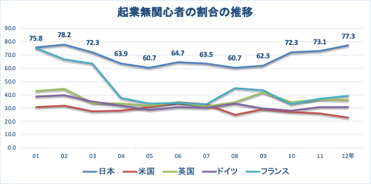 下のグラフは、世界と比較した起業に無関心な日本人の割合です。