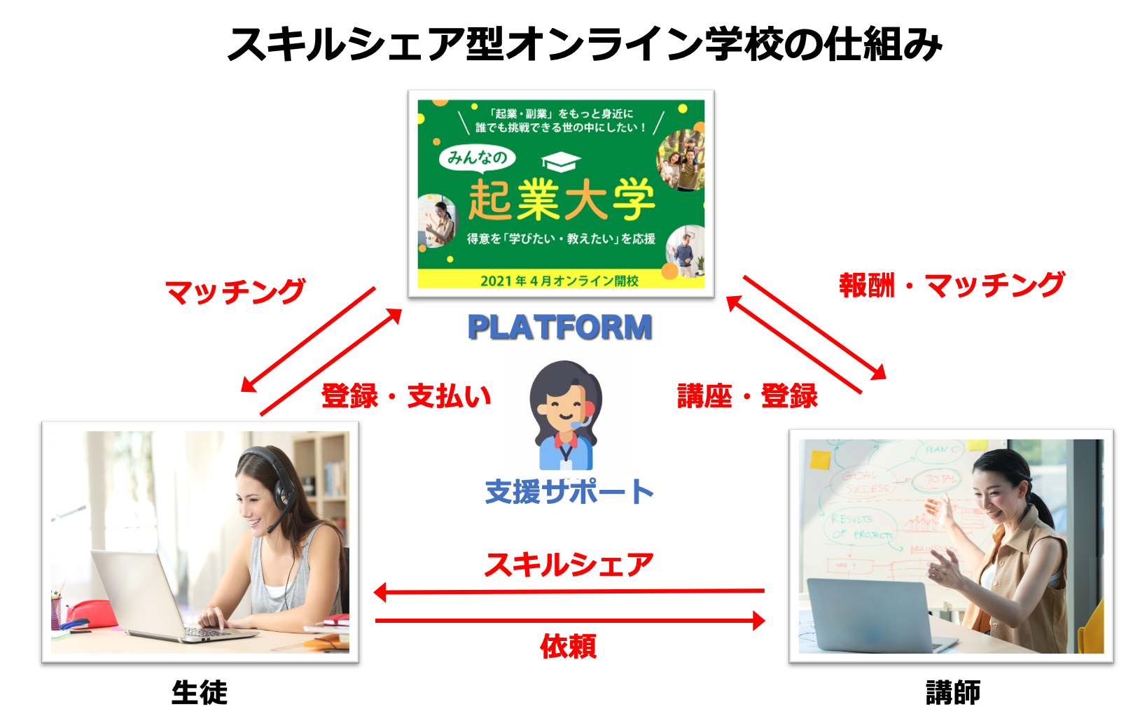 そんな思いで、オンラインを活用し、みんなが気軽に起業や副業を学べたり、教えたり、支援できる場所。スキルシェア型の起業支援スクール「みんなの起業大学」を開校したいと考えました。