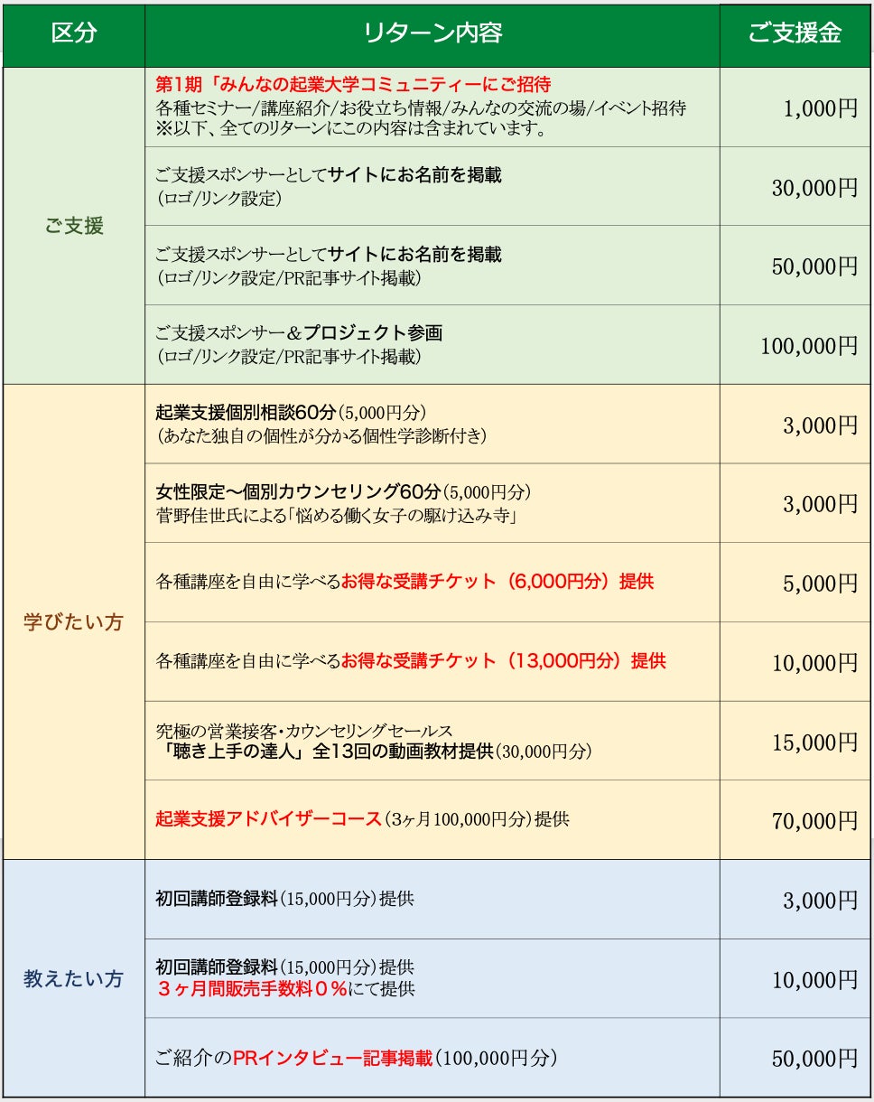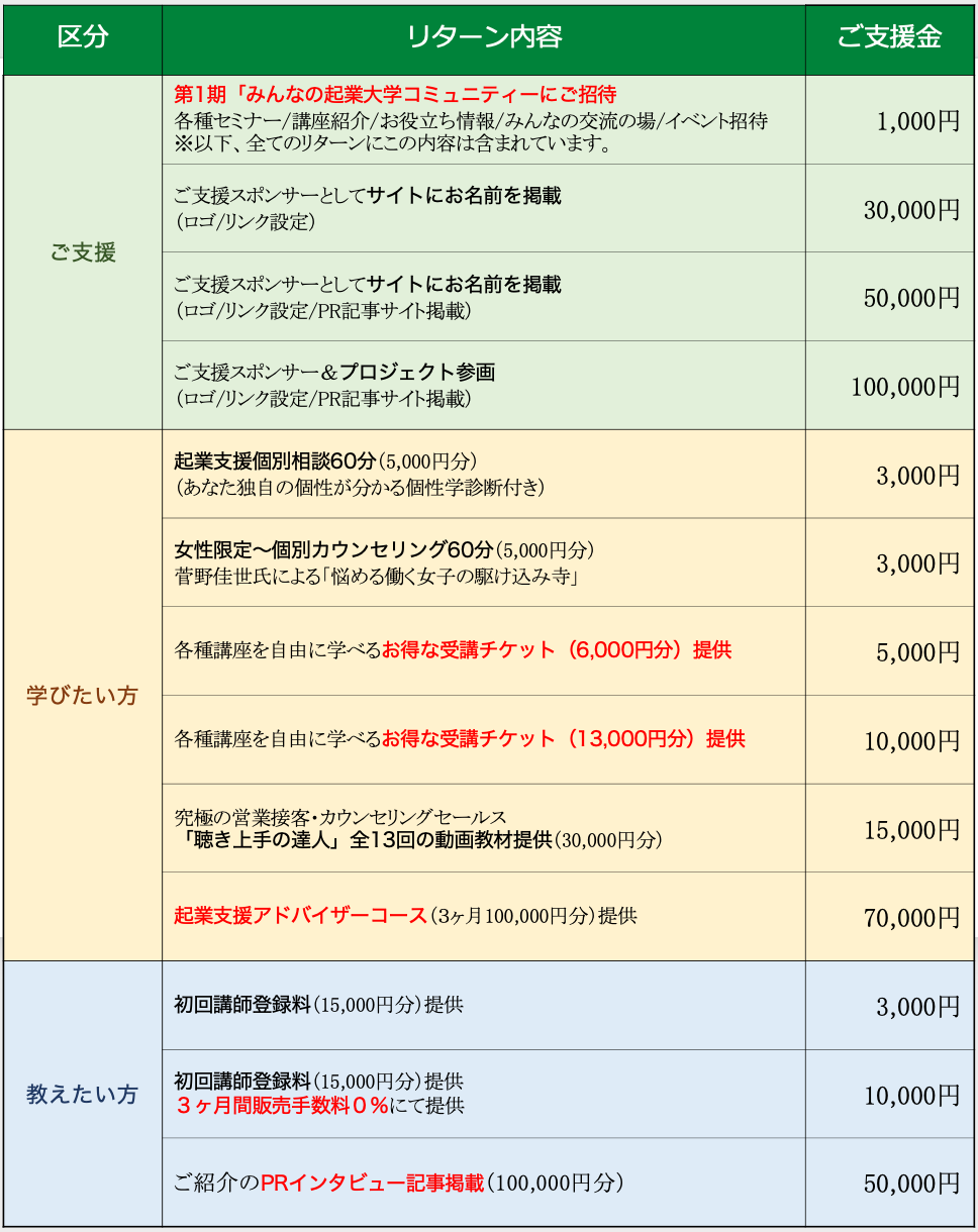 リターンについては学びた方・教えたい方・ご支援の3区分をご用意させて頂きます。