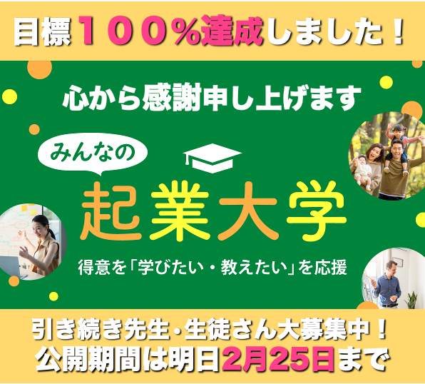 2021/02/26 06:37ご支援頂きました皆様へ昨日2月25日をもちまして本プロジェクトの募集が終了致しました。たくさんの皆様からのご支援とご参加により当初目標80万円に対し951,000円(目標対比119%)を達成することができました!本当にありがとうございました。心から厚く御礼申し上げます。今回のクラウドファンディングは一旦ここで募集終了となりますが今後「みんなの起業大学」の開校に向けて全力で準備を進めて参ります。現在の予定では、4月末の開校を予定しております。ご支援頂きました皆様には順次ご連絡をさせて頂きながらリターンの対応をさせて頂きたいと存じます。まずは、今回のプロジェクトが無事に達成したことのご報告とご支援頂いた皆様への感謝をお伝えさせて頂きます。この度は、誠にありがとうございました。引き続きの応援をどうぞよろしくお願い申し上げます。プロジェクト発起人小久保修司 もっと見る