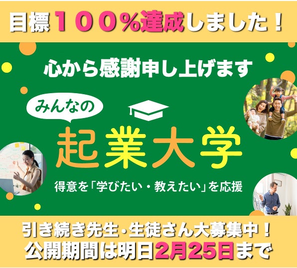 2021/02/24 09:24皆様からの多くのご支援とご参加により、おかげさまで当初目標金額を100%達成する事が出来ました!本当にありがとうございます。心より感謝申し上げます。たくさんのご期待とご支援のお声も頂いており大変嬉しく、とても励みにもなっております。ご参加頂く皆様にとって価値ある学校となるよう引き続き開校に向けて準備を行なって参りますのでどうぞよろしくお願い申し上げます。なお、本プロジェクトの公開期限は明日25日までとなっておりますので・先生になって頂ける方、・副業起業を学んでみたい方、・自立支援をサポートしたい方、・そしてそんな仲間とコミュニティを作り自己成長されたい方など、まだまだ大募集しております!引き続きのシェア拡散やご紹介にご協力頂けますと幸いです。どうぞよろしくお願い申しあげます。 もっと見る