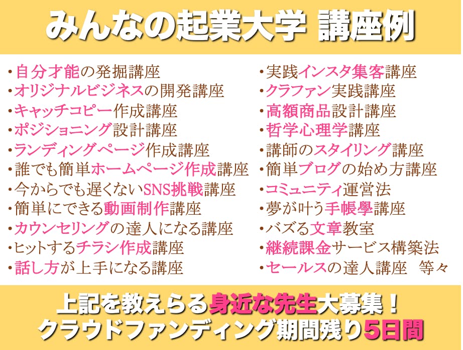 講座時間は1時間程度。講座料は一人あたり500円〜数万円まで設定自由で、参加者の数により収入も変わってきます。なお、集客活動はみんなの起業大学がまとめて広告展開を行う予定ですので講座開催に特化して頂くだけ大丈夫です。是非、身近な先輩起業家として教えて頂ける方のご登録をお待ちしておりますのでご紹介並びにシェアのご協力をお願い申し上げます。
