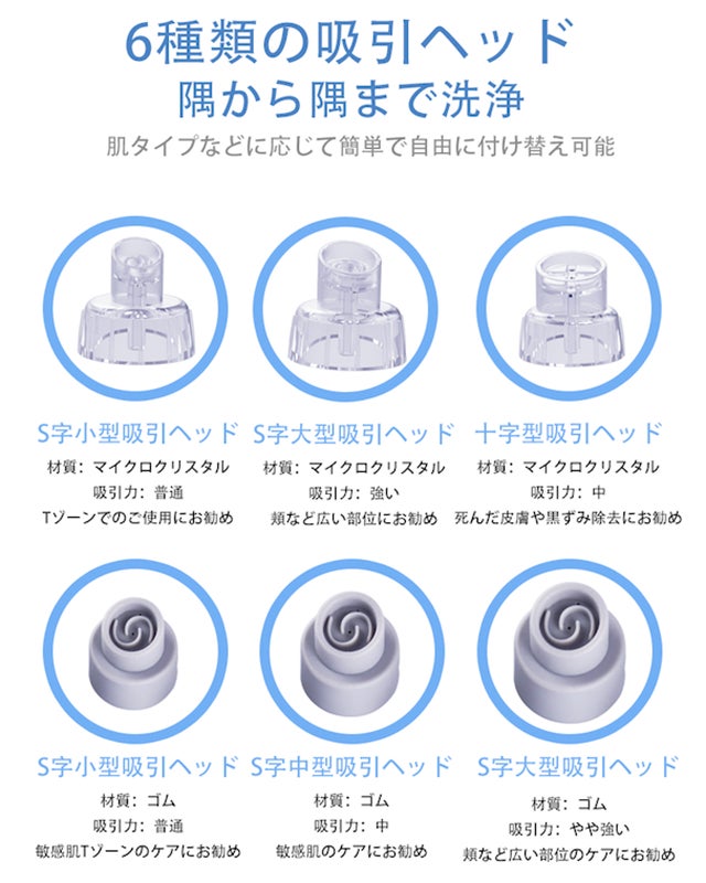 ゴム製のソフトヘッドとマイクロクリスタル製のハードヘッドが3つずつが付属しています。お肌の弱い方や敏感肌の方、初めてお使いの方はソフトヘッドからの使用をお薦めします。お肌の状態に合わせ、6種類の吸引ヘッドからお選びいただき、使い分けることができます。