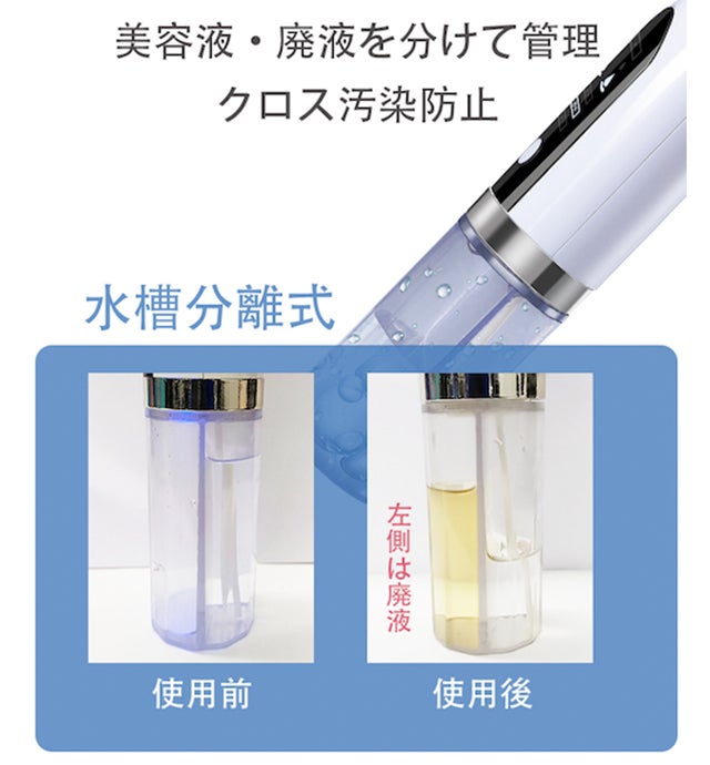 本体には分離型タンクがついております。タンク内部は2層に分かれていて、片方に綺麗な水や美容液などをセットし、洗い流した汚れがもう一方に溜まります。汚れた水や美容液などによる二次汚染のリスクを減らすことができます。汚れた水や美容液の再利用できないデザインです。