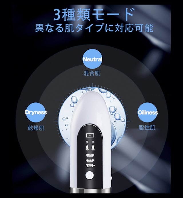 タイプの違う様々なお肌を考慮して調整できるように設計しています。個々の肌質や好み、その日のお肌の状態に合わせてDryness、NeutralとOilinessの3段階で切り替えることができます。吸引力もその切り替えに合わせて普通、やや強い、強いの順で変わります。
