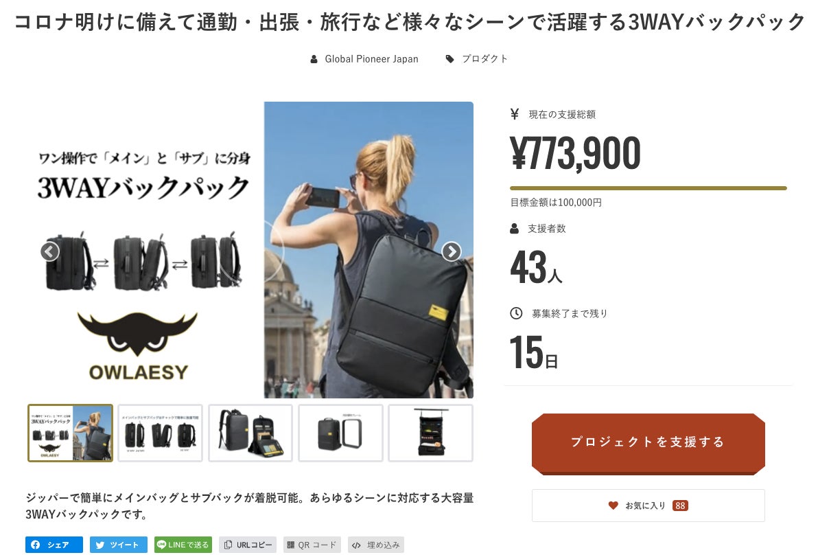 2021/05/15 14:40皆様、こんにちは。Global Pioneer Japanです。週末はいかがお過ごしでしょうか?コロナのために外出や旅行を我慢していませんか?私はコロナが落ち着いた後に何をやろうか、どこに行こうかなど、色々と考えたり、計画や準備したりしています。私の同じことを考えている方もいらっしゃるかなと思います。そこで、【新商品】コロナ明けに備えて通勤・出張・旅行など様々なシーンで活躍する『3WAYバックパック』について案内させていただきます。https://camp-fire.jp/projects/410004バッグで3wayと聞くと「リュック、手提げ、斜め掛け」を想像するかもしれません。でも、現在クラウドファンディングサイトmachi-yaにてキャンペーン実施中の「3WAYバックパック」は、もう少しダイナミックに変化します。一見すると大容量の単体バックパックですが、その実2種類のバックパックの複合体という、ユニークなこのプロダクト。旅行や出張、通勤などで活躍するんです。旅行/日常を問わず使える「3WAYバックパック」はクラウドファンディングサイトmachi-yaにてキャンペーン中。一般販売予定価格から早割35%OFFの18,400円(税・送料込)と、お得に手に入りますよ。気になる方は下記URLからチェックしてご検討してください!https://camp-fire.jp/projects/410004Global Pioneer Japanプロジェクトチーム もっと見る