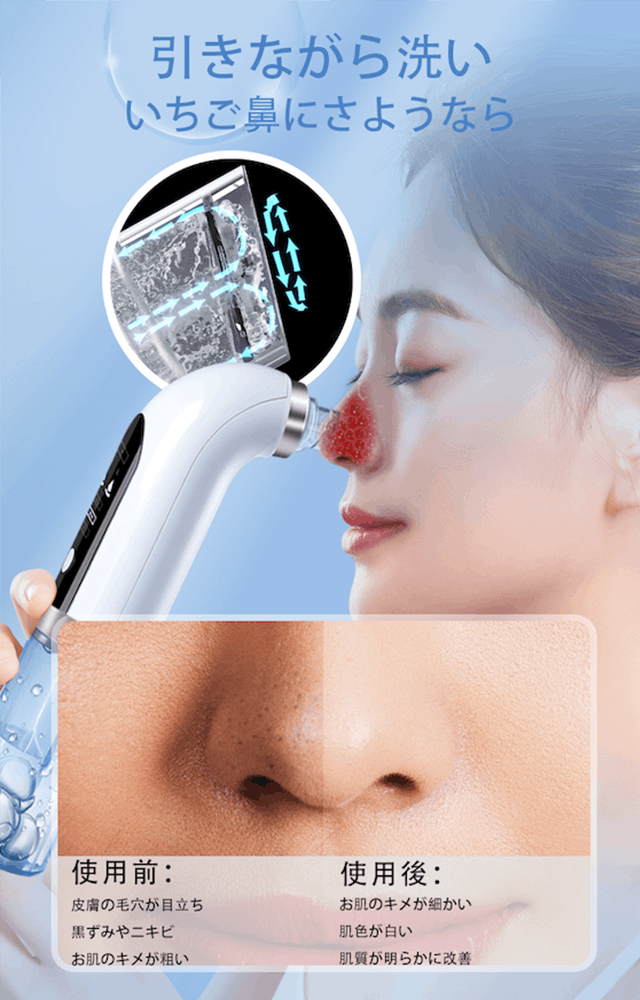 今の時代日常生活でマスクを付けるのはスタンダードになりつつあります。しかし、マスクによる肌問題に悩む方が多くいらっしゃると思います。「毛穴吸引美顔器」を通じて、皆様により健康な肌でいられるように貢献したいと思います。
