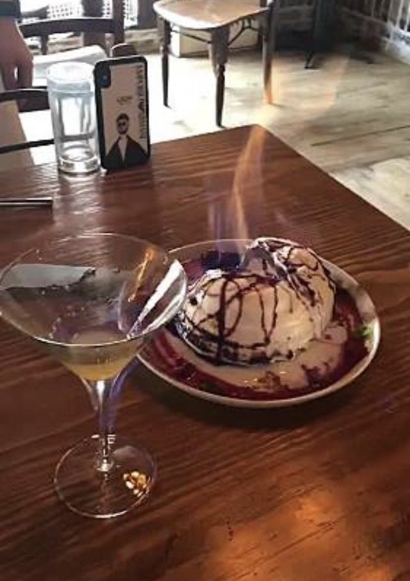 アイスケーキをメレンゲで覆い、火のついたリキュールをかけて提供するベイクド・アラスカ