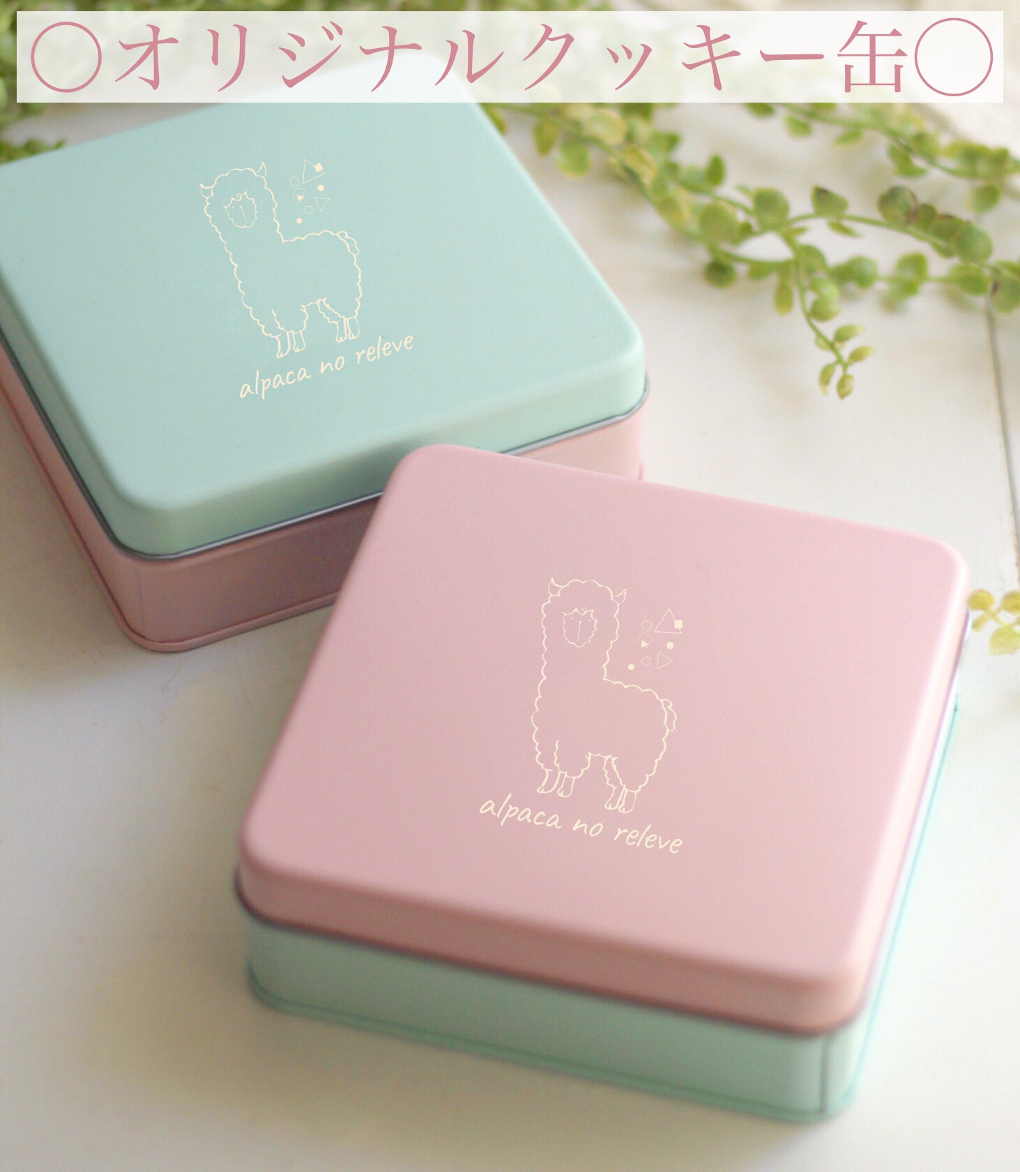 ピンク×ミントブルーのパステルな缶に、当店のロゴを入れたオリジナル缶。