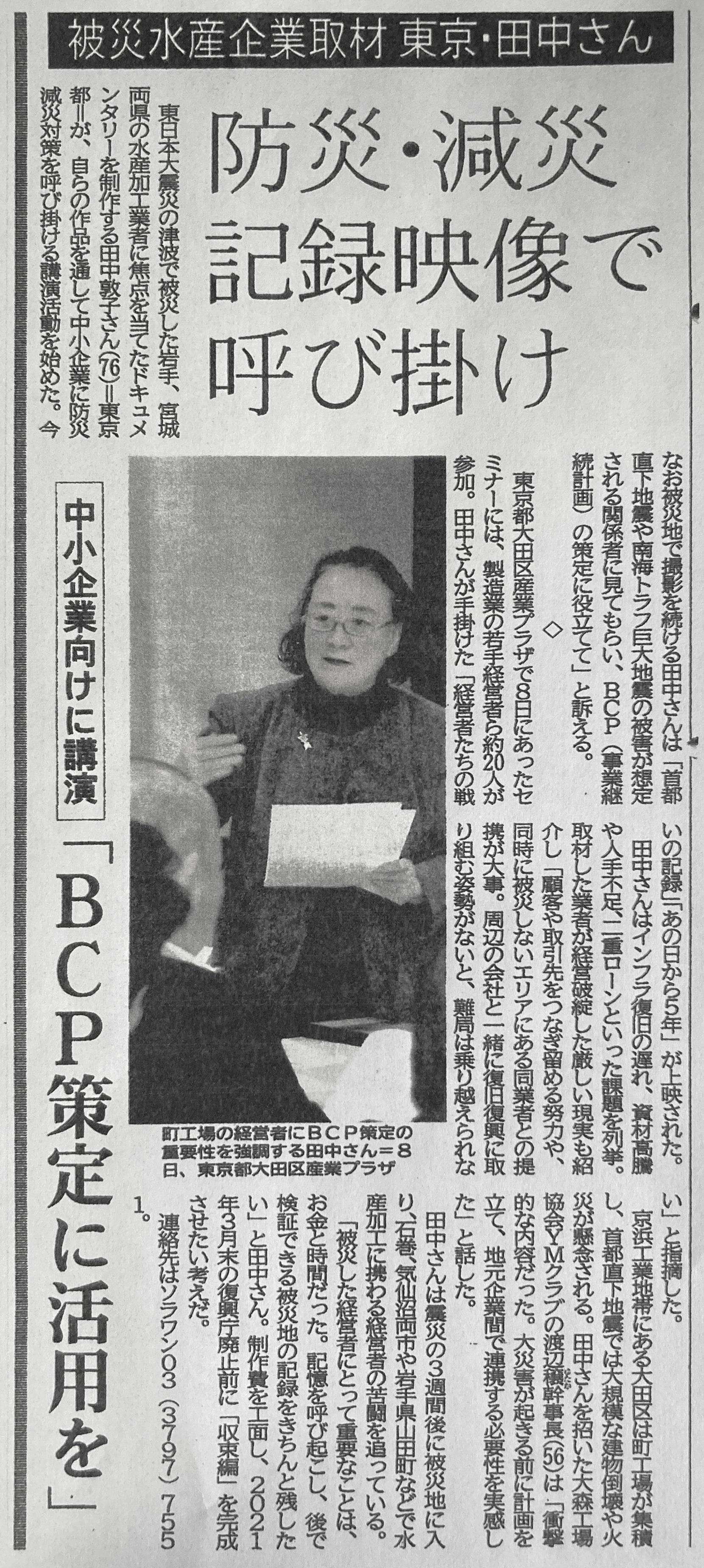 東京大田区蒲田 2019年2月、弊社の「復興記録映像」が地域の町工場の防災に役立つと、 多数の町工場を抱える東京大田区役所が気付き、区内2か所の図書館にDVDを購入。このDVDを 蒲田・大森などの町工場経営者グループが借りて、大田区産業プラザで無料上映会を開催しました。「被災した中小企業その後のBCP策定のヒント」と題した上映会の模様は、仙台に本社のある新聞社「河北新報」が取材し、被災地に伝えました。