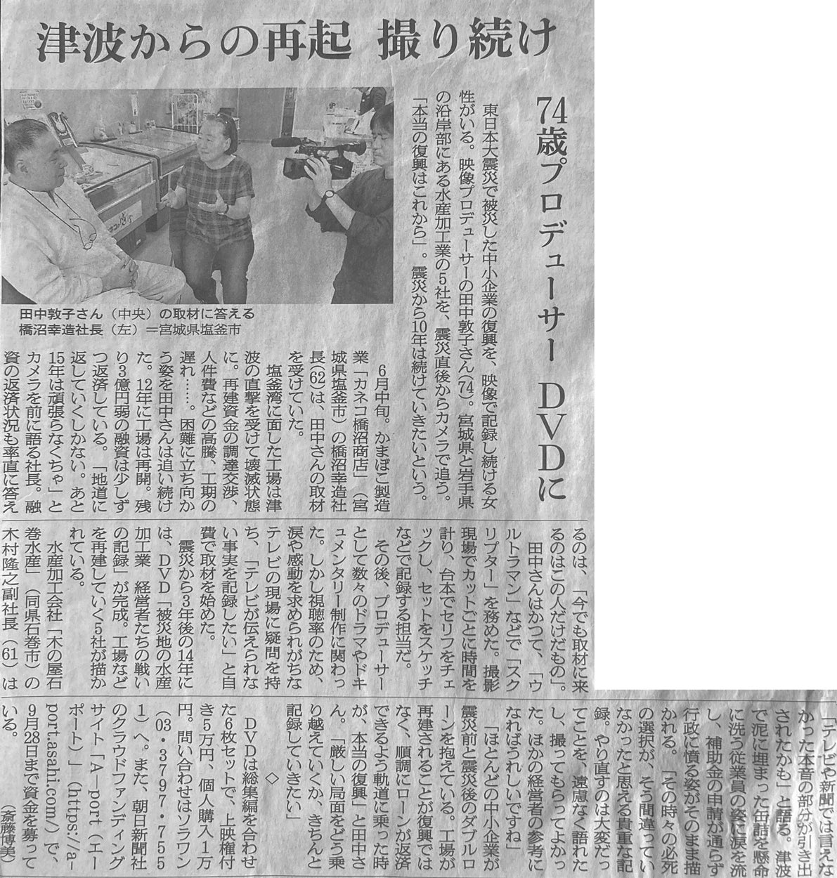 弊社の第1弾DVD『被災地の水産加工業 経営者たちの戦いの記録』(全6巻)は、2014年に3年間を掛けて完成しました。震災1年目は被災地の変動が著しく撮影日数は100日を超え、途中資金が尽き自宅を担保に金融機関から1700万円の融資を受け撮影を続け、DVD化に至りました。何度か断念しようと思いましたが、苦境に立たされている経営者の現実を前にして、記録を中断することができませんでした。またマスコミが伝えない出来事が次々起き、記録を残す意味からも止めるわけにはゆきませんでした。