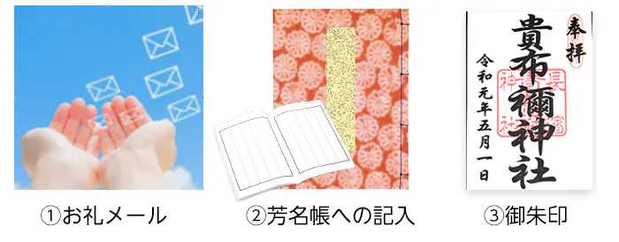 今回、この御支援していただいた方には、芳名帳に記載させて頂きまして、また1万円以上の方には、神社内の芳名板を設置して、お名前を刻むことと致します。再建した暁には、貴布禰神社再建報告祭(仮称)を斎行し、祝詞にてご支援頂いた方のお名前を御神前に奏上(報告)させていただきます。