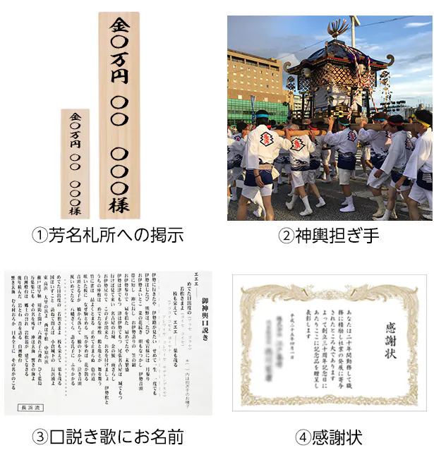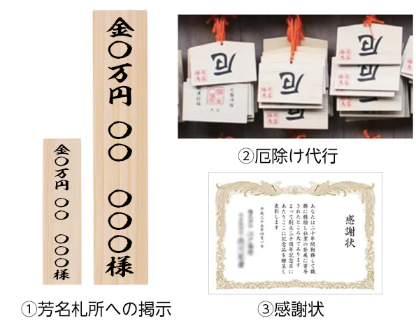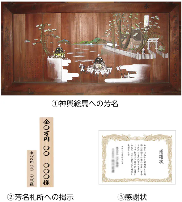 ①芳名札所への掲示:境内に設置する芳名板(45×150mm)と修復完成後に拝殿内の壁の芳名板(70×300) に支援金額とお名前を掲示いたします。 ※建物修復工事には長期間を要します。拝殿内の芳名板は修復完了後に写真を撮ってお送りしますことをご了承ください。メールにてお知らせ致します。