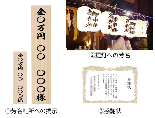 ②提灯への芳名:祭りの際に境内に吊るす提灯にお名前を掲示いたします。※飾った様子を撮ってお送りしますことをご了承ください。メールにてお知らせ致します。