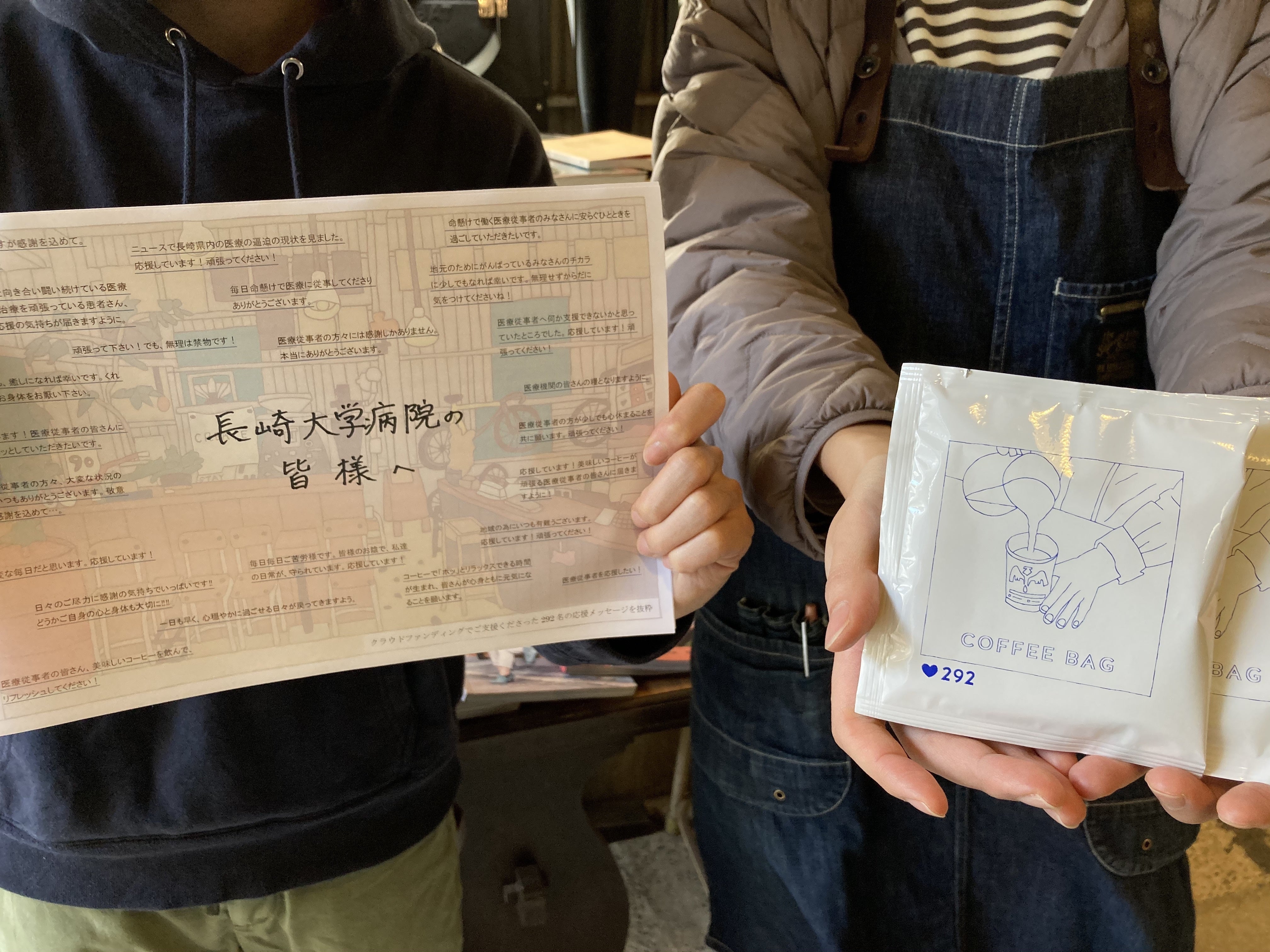 お店ではコーヒーバッグの医療機関への送付、リターンの準備がすすんでいます。今回作成したコーヒーバッグのデザインは佐世保市のミナトマチファクトリーのイラストレーターMEGUMIさんが描いてくださったもの。それに今回の支援者数292名を表す数字を加えています。医療機関に送るコーヒーバッグには、皆様からの支援メッセージのなかから医療従事者へ向けたものを抜粋し、寄せ書きにして同封させていただきました。医療機関への送付は来週頭までに、リターンの送付は今月末をめどに完了する見込みです。到着まで今しばらくお待ちください。