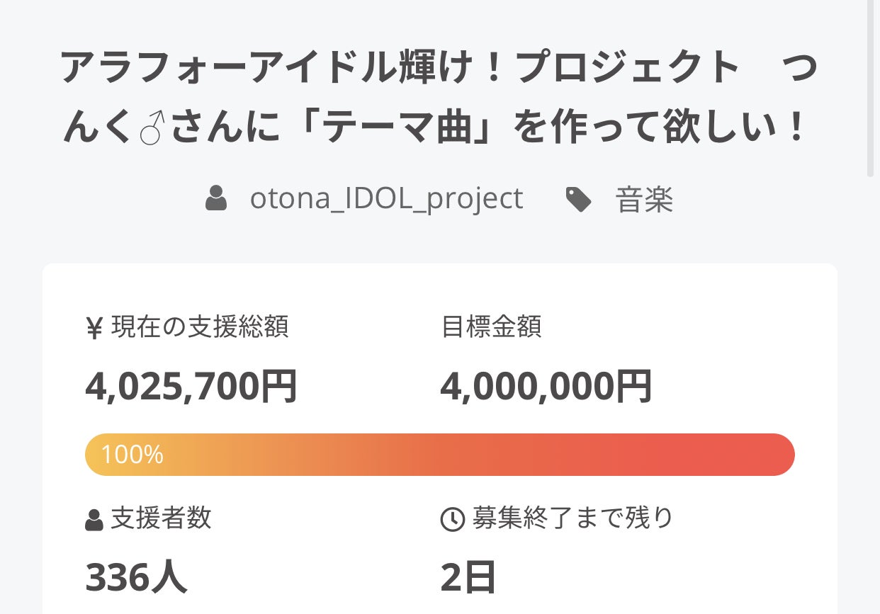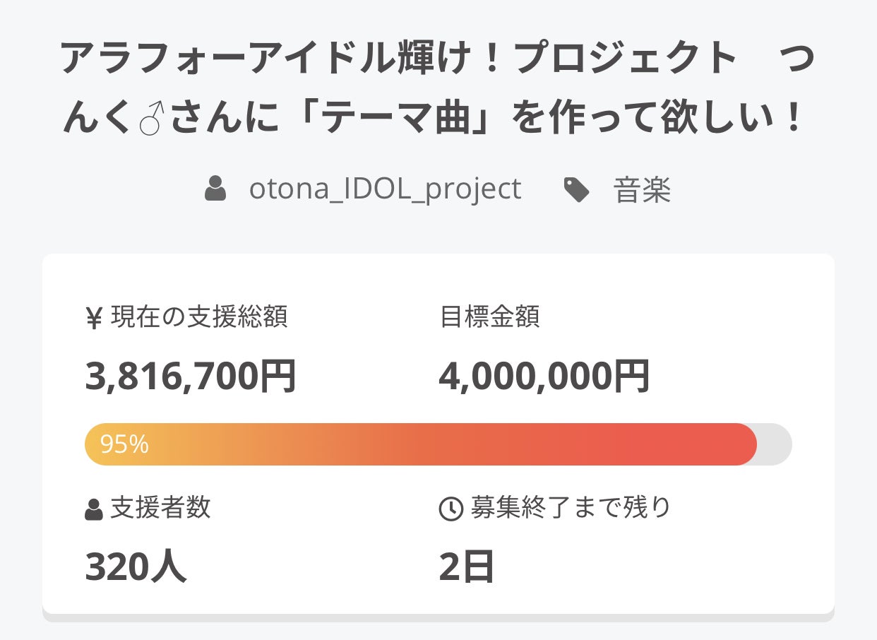 皆様のご支援のお陰様で95%まで達成できました!支援金合計額 3,816,700円!残金 183,300円 です!最後の追い込みが流石同世代、アラフォー以上の方々が多いだけあって勢いが本当に凄いです!!今日達成を目標にしています!引き続き、拡散にもご協力をお願いいたします!本当にありがとうございます!!