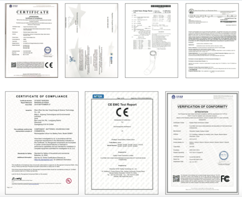Shenzhen Eigday Heating Ltd.は、スポーツ用品と電子ハイテクを組み合わせて、あらゆる種類の加熱および冷却製品を開発しています。すべての加熱された製品は、PSE認証の他、CE、ROHS、UL、FCCなどの信頼できる証明書に合格しており、発明、外観、ユーティリティモードに関する一連の特許も適用されています。