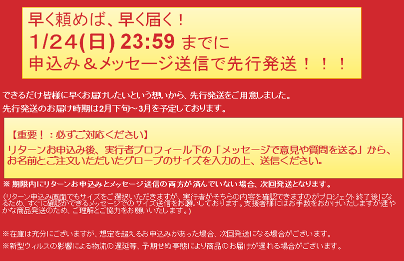 ※先行発送、通常発送ともにできるだけ皆様に早くお届けできるよう努めてまいりますが、予期せぬ事態によりお届けが遅れる場合がございます。 その際は活動レポートにて速やかにご報告致します。