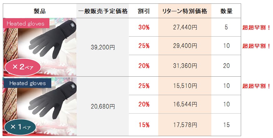 2021/07/02 16:21いつも応援ありがとうございます。「【先行発送あり☆】凍える手をすぐに温めてくれる即温ヒートグローブ!」プロジェクトオーナーのNishipara Tradingです。今年の1月から2月にかけて行なった本プロジェクトでは、たくさんの応援・ご支援をいただきまして誠にありがとうございました。さてこの度、ヒートグローブを手掛けておりましたアウトドア用品メーカー SAVIORより、新商品のHeated Bootsと、新モデルのHeated Liner Glovesの販売が決まりました!新モデルのグローブではUSB充電対応に改良されております。日頃より応援いただいております皆様にいち早くお知らせしたく、ご連絡させていただきました。是非一度、下記リンクをご確認ください!★7月3日(土) 15:00 発売!【Heated Bootsご案内 】 先着30足限定・15%OFF!https://peraichi.com/landing_pages/view/heatedboots【Heated Liner Glovesご案内】 先着20組限定・15%OFF!https://peraichi.com/landing_pages/view/heatedlinerglovesまた今回、スペアバッテリーの販売も予定しております。ご購入を希望の方は購入先ページのご連絡をさせていただきますので、ぜひリンク先のLINE登録をお願いいたします!Heated Bootsヒートグローブ同様、即温性、撥水性を備えているのはもちろんのこと、鮮やかな4色のカラー展開で、性別を問わず多くの方にご使用いただけるブーツとなっております。Heated Liner Gloves前回のヒートグローブの使用感はそのまま、充電器がUSB充電対応に改良されました!※充電器のみの販売はございませんのでご了承ください。早めの寒さ対策に、Heated Boots & Liner gloves をご検討いただけますと幸いです。今後も、より良い暮らしのためになる商品をお届けできるよう努めてまいりますので、宜しくお願いいたします。Nishipara Trading もっと見る【残り3日】感謝☆ご支援金額15万円を突破しました!!