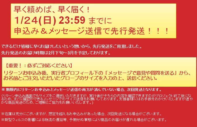 いつも応援ありがとうございます。Nishipara Tradingです。いよいよ本日1/24 (日) 、「【先行発送あり☆】凍える手をすぐに温めてくれる即温ヒートグローブ!」の先行発送お申込み最終日となりました。先行発送のお申込み期限は、本日 23:59 です!先行発送にお申込みいただいた方には、プロジェクト終了後、速やかにリターンを発送させていただく予定です。このヒートグローブで寒さを乗り切っていただくため、ひとりでも多くの方に、リターンを早くお届けしたいと思っております。ぜひご希望の方は、本日中にお申し込みをお願いいたします。どうぞ宜しくお願いいたします。Nishipara Trading